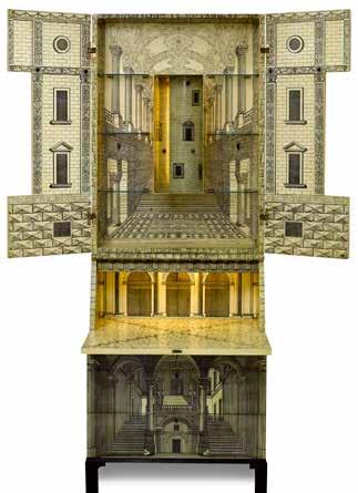 Ponti and Fornasetti’s trumeau was a striking and wholly modern expression of the optical illusions to be found in the works of past artists and architects. They conceived the novel idea of covering every inch of the cabinet with woodcuts designed by Fornasetti based on illustrations from sixteenth- and seventeenth-century treatises on architecture and on actual historical buildings such as the Palazzo Alessi in Genoa and the Palazzo Marino in Milan. With their refined sense of aesthetics and maniacal attention to detail, they designed the cabinet so that in whatever combination its various parts were opened or shut, a different and intriguing perspective would be presented to the viewer—of arcades, staircases, receding lines of sculpted columns, and concave and convex surfaces—deliberately creating visual confusion and posing the half-ironic question as to what purpose this piece of furniture was actually intended to serve.