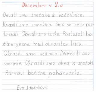 Prvi praznik, ki ga slavnostno in v krogu svoje družine v decembru praznujemo, je božič, eden izmed najbolj pomembnih krščanskih praznikov. Božič je dobra priložnost, da se posvetimo naši družini in ljubljenim. Za vas, otroke, je to seveda izjemno priljubljen čas, saj vas pride obiskat eden izmed dobrih mož – Božiček. Doma boste, ali pa ste morda že, pridno pomagali vašim staršem pri okraševanju in postavljanju božičnega drevesa, kjer vas bodo ob tem čudovitem prazniku pričakala tudi Božičkova darila. Slovenci in Slovenke pa se, le dan po božiču, spomnimo in praznujemo tudi »rojstni« dan naše države, Slovenije. 26. decembra namreč obeležujemo dan samostojnosti in enotnosti, ko se spominjamo razglasitve samostojnosti naše države. Gre za zelo pomemben praznik za vse prebivalce Slovenije, saj smo se ravno na ta dan v letu 1990 odločili za samostojno Slovenijo. Seveda pa se ta praznični konec leta, kot vedno, konča s silvestrovanjem. Ta