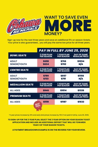 FLEX PACKS CAN’T MAKE IT TO EVERY GAME? BUT STILL WANT TO ENJOY ALL THE FAMILY FUN AND EXCITEMENT OF THE OSHAWA GENERALS? $126 6 VOUCHERS $243 12 VOUCHERS $351 18 VOUCHERS VOUCHERS GIVE YOU THE FLEXIBILITY TO ATTEND GAMES AT YOUR CONVENIENCE, AS THEY CAN BE EXCHANGED FOR SEATS TO ANY REGULAR SEASON HOME GAME. EXAMPLE: A 12 GAME FLEX PACK HOLDER CAN REDEEM VOUCHERS FOR ONE SEAT TO 12 GAMES, TWO SEATS FOR 6 GAMES OR ANY OTHER COMBINATION. *PRICE INCLUDES TAX AND CITY OF OSHAWA SURCHARGES BASED ON BOWL SEATING CONTACT ANDREW RICHARD 905 433-0900 EXT 2238 OR ARICHARD@OSHAWAGENERALS.COM