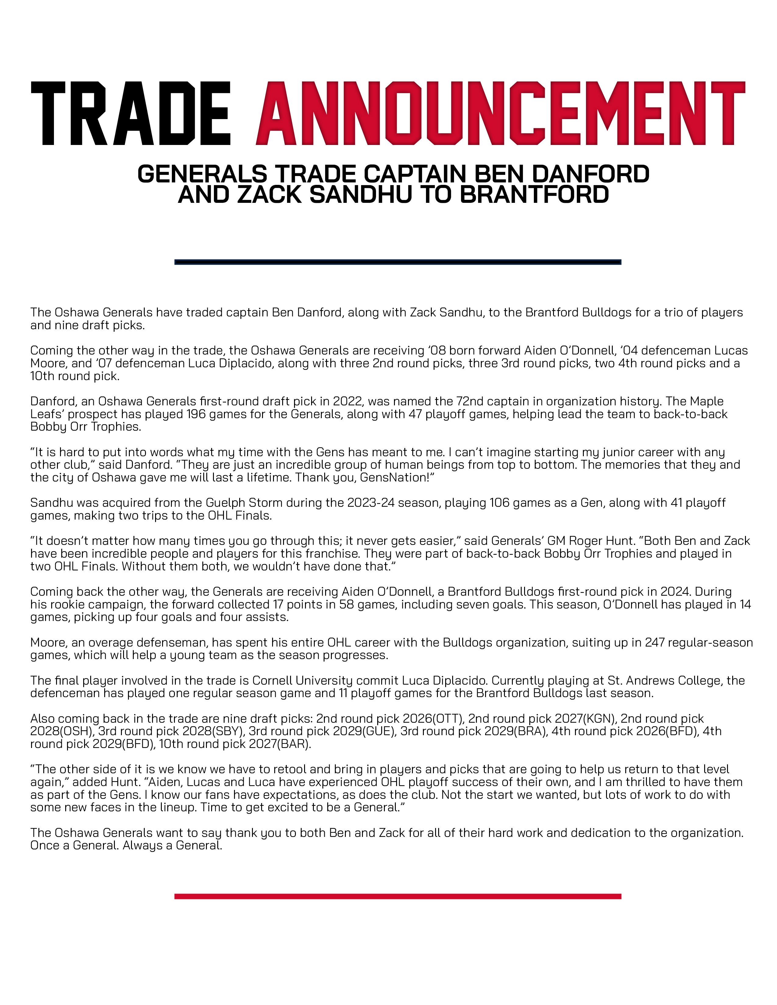 The Generals have many players eligible to return: Beckett Sennecke, Ben Danford, Owen Griffin, Simon Wang and Zack Sandhu to name a few. However, all five are expected to be out of action to start the season as they attend NHL training camps.