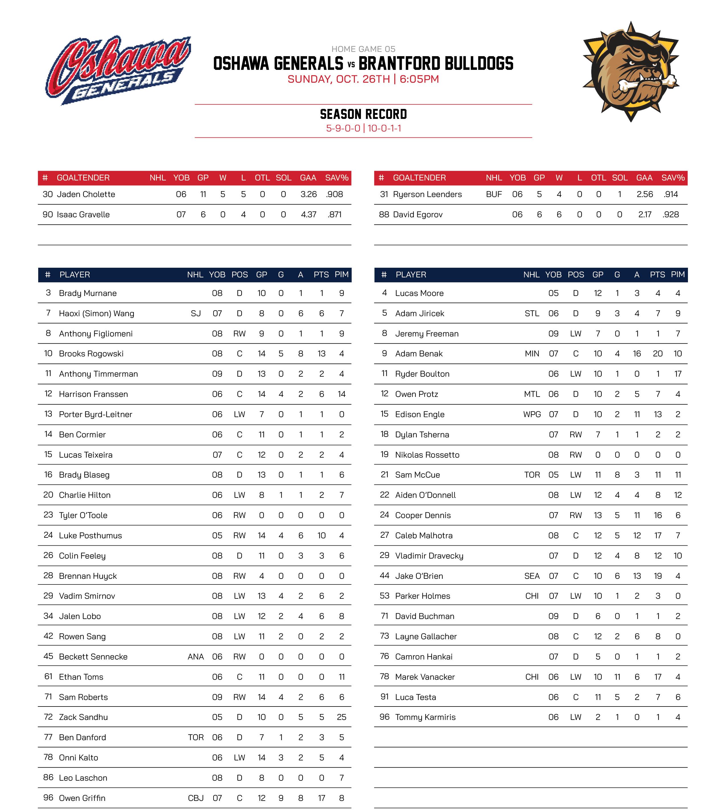A great start from the Generals was countered by a strong showing from Brantford in the middle period as they got their feet moving and outshot Oshawa 14-9. Both Cholette and Egorov came up with some key saves to prevent more goals each way.