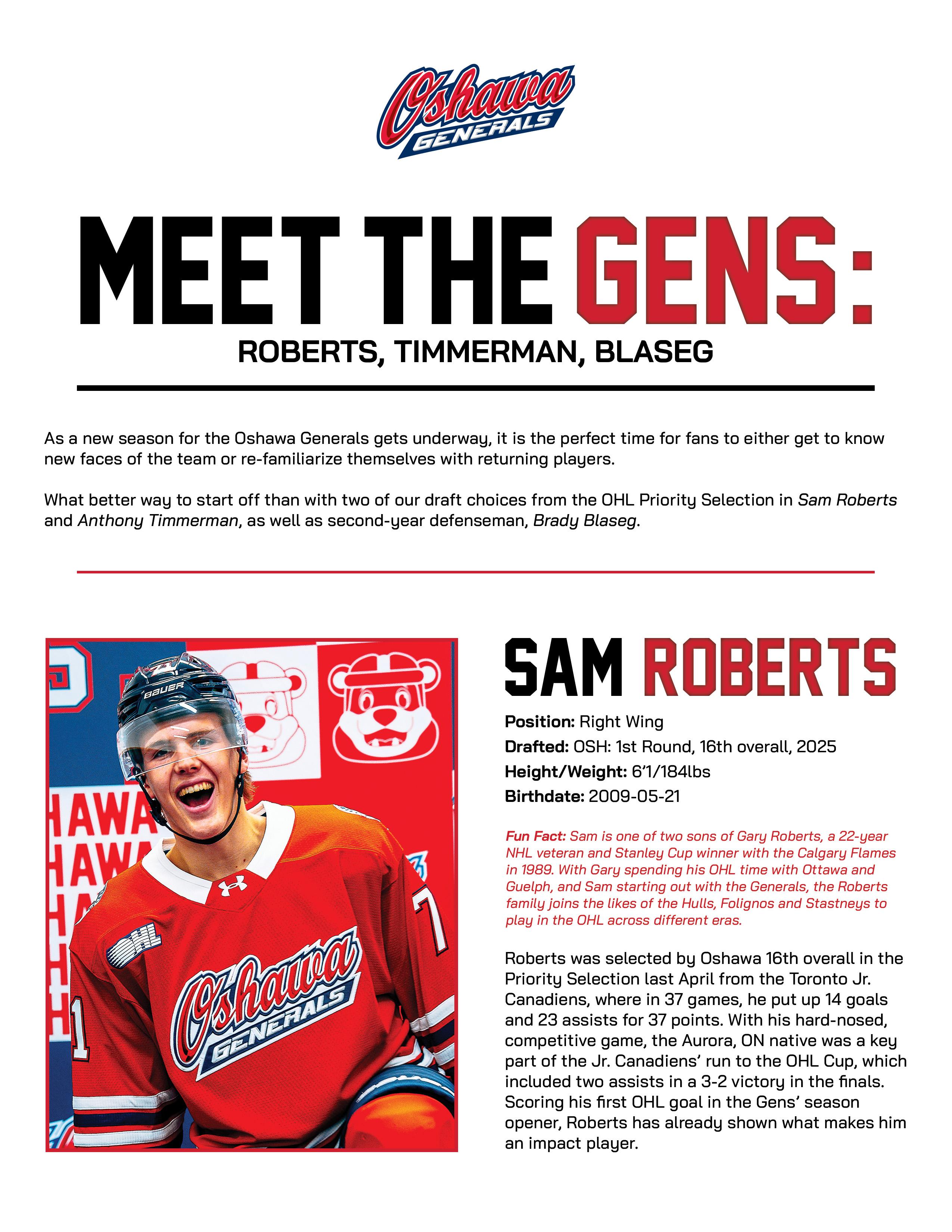 Roberts, the 16th overall selection from the Toronto Jr. Canadiens in April, brings a similar, hard-nosed style game as his father, Gary. Timmerman, out of Rochester, MI, and Laschon from Pittsburgh, PA, also bring valuable depth to the Generals’ blue line. Kalto’s size and Smirnov’s skill should contribute nicely to Oshawa’s scoring depth as well.