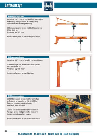 JOB søylesvingkraner Kan svinge 360°. Leveres komplett i.h.t. spesifikasjon JOB søylesvingkraner leveres med lastekapasitet fra 125 til 10000 kg. Armlengde opp til 5 meter Kontakt oss for priser og spesifikasjoner.