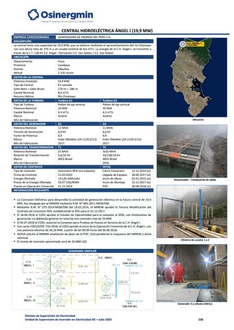 CENTRAL HIDROELÉCTRICA ÁNGEL I (19,9 MW) EMPRESA CONCESIONARIA GENERADORA DE ENERGÍA DEL PERÚ S.A. DESCRIPCIÓN La central tiene una capacidad de 19,9 MW, que se obtiene mediante el aprovechamiento del río Chiamayo con una altura neta de 270 m y un caudal nominal de 8,6 m³/s. La energía de la C.H. Ángel I, se transmite a través de la L.T. 138 KV S.E. Ángel - Derivación S.E. San Gabán / S.E. San Rafael. UBICACIÓN Departamento Puno Provincia Carabaya Distrito Ollachea Altitud 2 535 msnm DATOS DE LA CENTRAL Potencia Instalada 19,9 MW Tipo de Central En cascada Salto Neto – Salto Bruto 270 m – 286 m Caudal Nominal 8,6 m3/s Recurso Hídrico Río Chiamayo DATOS DE LA TURBINA Turbina G1 Turbina G2 Tipo de Turbina Pelton de eje vertical Pelton de eje vertical Potencia Nominal 10 MW 10 MW Caudal Nominal 4,3 m3/s 4,3 m3/s Marca Andritz Andritz Año de Fabricación DATOS DEL GENERADOR G1 G2 Potencia Nominal 11 MVA 11 MVA Tensión de Generación 6,6 kV 6,6 kV Factor de Potencia 0,9 0,9 Marca Indar (Modelo LSA-1120-Z/12) Indar (Modelo LSA-1120-Z/12) Año de Fabricación 2017 2017 DATOS DEL TRANSFORMADOR T1 T4 Potencia Nominal 25 MVA 3x35 MVA Relación de Transformación 6,6/33 kV 33/138/10 kV Marca WEG-Brasil WEG-Brasil Año de Fabricación 2016 DATOS DE CONTRATO HITOS Tipo de Contrato Suministro RER (1ra Subasta) Cierre Financiero 12.12.2014 (si) Firma de Contrato 31.03.2010 Llegada de Equipos 30.06.2017 (si) Energía Ofertada 131,05 GWh/año Inicio de Obras 02.01.2015 (si) Precio de la Energía Ofertada 59,97 US$/MWh Inicio de Montaje 15.12.2017 (si) Puesta en Operación Comercial 31.12.2014 POC 30.08.2018 (si) INFORMACIÓN RELEVANTE La Concesión Definitiva para desarrollar la actividad de generación eléctrica en la futura central de 19,9 MW, fue otorgada por el MINEM mediante R.M. N° 483-2011-MEM/DM. Mediante R.M. N° 075-2014-MEM/DM del 18.02.2014, el MINEM aprobó la Tercera Modificación del Contrato de Concesión RER, estableciendo la POC para el 31.12.2017. El 18.06.2018 el COES aprobó el Estudio de Operatividad para la conexión al SEIN, con limitaciones de generación no debiendo generar en total las tres centrales más de 33 MW. El 03.07.2018 el COES, autorizó la Conexión para Pruebas de Puesta en Servicio de la C.H. Ángel I. Con carta COES/D/DP-710-2018, el COES aprobó el inicio de la Operación Comercial de la C.H. Ángel I, con una potencia efectiva de 20,16 MW, a partir de las 00:00 horas del 30.08.2018. GEPSA solicitó al MINEM ampliación de plazo de la POC. Está pendiente la respuesta del MINEM a dicha solicitud. El monto de inversión aproximado será de 26 MM US$.