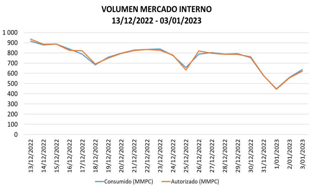Del Mecanismo de Racionamiento activado por RD 411-2022-MINEM/DGH, en relación con los volúmenes de gas natural autorizados por el Transportista y los volúmenes medidos para cada día operativo, éstos se muestran en el Gráfico 55. Al respecto, se observa que las empresas consumieron un volumen ligeramente menor al total autorizado por el Transportista, teniendo una variación de -0,02%. Cabe precisar que durante la vigencia de este Mecanismo de Racionamiento, no hubo restricción de gas natural para el mercado interno.