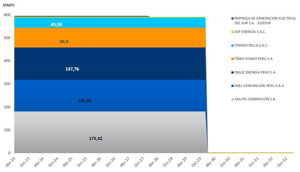 0 100 200 300 400 500 600 700 800 900 Abr-23 Ene-24 Oct-24 Jul-25 Abr-26 Ene-27 Oct-27 Jul-28 Abr-29 Ene-30 Oct-30 MMPCD Contratos Transporte Contratos Suministro