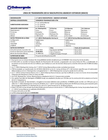 SUPERVISOR DE OBRA INFORMACIÓN RELEVANTE. El proyecto tuvo un retraso inicial por No Compatibilidad emitido inicialmente por el SERNANP. Este retraso fue de dos (2) años. El 04.01.2013 se suscribió la Primera Adenda de Reactivación del Contrato, programando una nueva fecha de POC y considerando un incremento en la inversión de US$ 12,5 millones, que totalizan un costo de inversión del proyecto a nivel de oferta de US$ 75 MM US$ (Base Tarifaria). La L.T. 138 kV Machupicchu‐Suriray y la L.T. 220 kV Suriray‐Abancay Nueva están concluidas (una terna). CTM ha instalado un transformador de 225 MVA‐138/220 kV en la S.E. Suriray (el Anexo N° 1 del Contrato especifica que el trasformador debía instalarse en la S.E. Machupicchu). La longitud de la L.T. 138 kV Machupicchu‐Suriray ha variado de 6 k a 8,5 km. La L.T. 220 kV Suriray‐Cotaruse Nueva y la L.T. 220 kV Abancay Nueva‐Cotaruse; que han modificado su trazo en el sector de la Comunidad Campesina de Pampamarca, tiene un avance de 98%. Las SS.EE. Machupicchu, Suriray, Abancay Nueva y Ampliación de la S.E. Cotaruse está concluida. Con opinión favorable de Osinergmin el MINEM otorgó una ampliación de plazo por 150 días, por la construcción de la variante en el sector de la C.C. Pampamarca. Aprobado el Estudio de Operatividad y otorgada la Concesión Definitiva (aún pendiente), el MINEM puede acordar con CTM para que se utilice la L.T. 138 kV Machupicchu‐Suriray de 250 MVA y la L.T. 220 kV Suriray‐Abancay‐Nueva de 250 MVA (una terna), para transmitir parte de la energía de EGEMSA (C.H. Machupicchu II) y LDS (C.H. Santa Teresa) a la S.E. de Abancay Nueva. El día 27.05.2015 se han iniciado las pruebas finales para la Puesta en servicio de la L.T. 138 kV Machupicchu‐Suriray; las pruebas finales de la L.T. 220 kV Suriray‐Abancay se realizarán el 04.06.2015. El avance de la obra es de 98%. La POC está programada para el 24.08.2015.