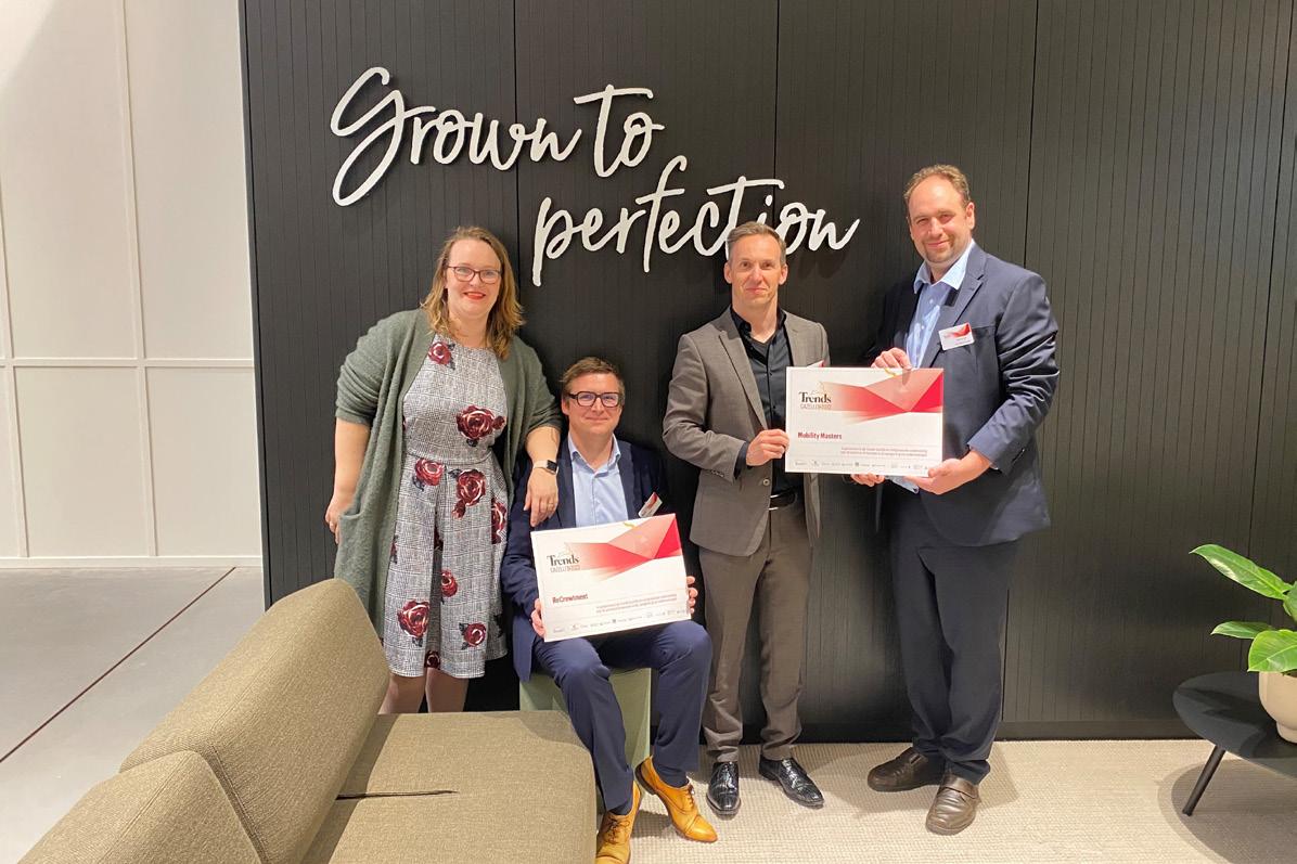 Spanning troef tijdens uitreiking Elk jaar selecteert het economische magazine Trends de snelst groeiende bedrijven die een positieve invloed hebben op het ondernemingsklimaat in hun regio. In de provincie Antwerpen werd Mobility Masters voor het tweede opeenvolgende jaar geselecteerd. Recrewtment ontving een eerste nominatie.