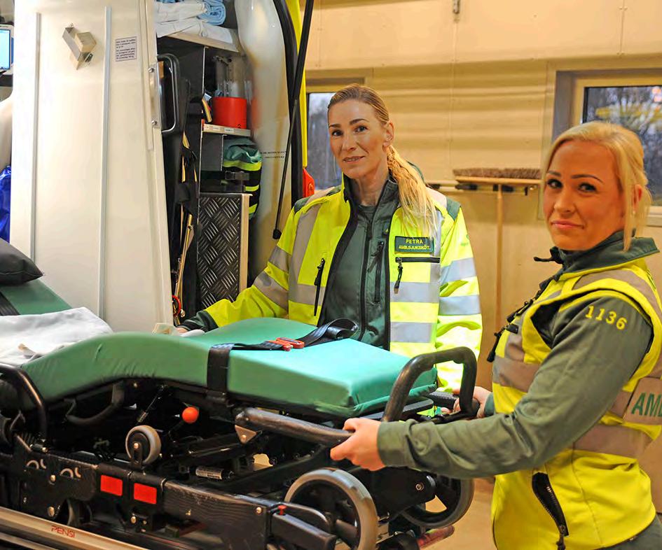 på ett av sjukhusens akutrum. Vi kan dock inte röntga eller operera i ambulansen, men vi behandlar givetvis alla de skador vi ställs inför, säger Petra. Både Petra och AnnaCarin trivs i sina arbetsroller och framhåller det goda kamratskapet på ambulansstationen. De gillar också det faktum att den ena dagen inte är den andra lik och att jobbet aldrig blir rutin. Allt kan hända och det handlar hela tiden om problemlösning av olika slag.