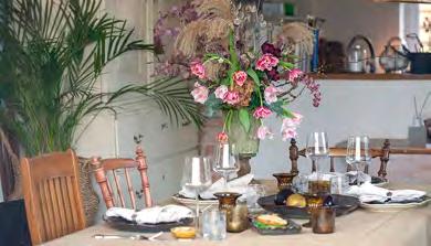 I den här dukningen har porslin i bruna toner använts. Tulpanerna har placerats i en mindre urna på fot. Höjden på urnan gör att de hängande tulpanerna kommer mer till sin rätt och det rustika uttrycket gifter sig perfekt med den yviga buketten.