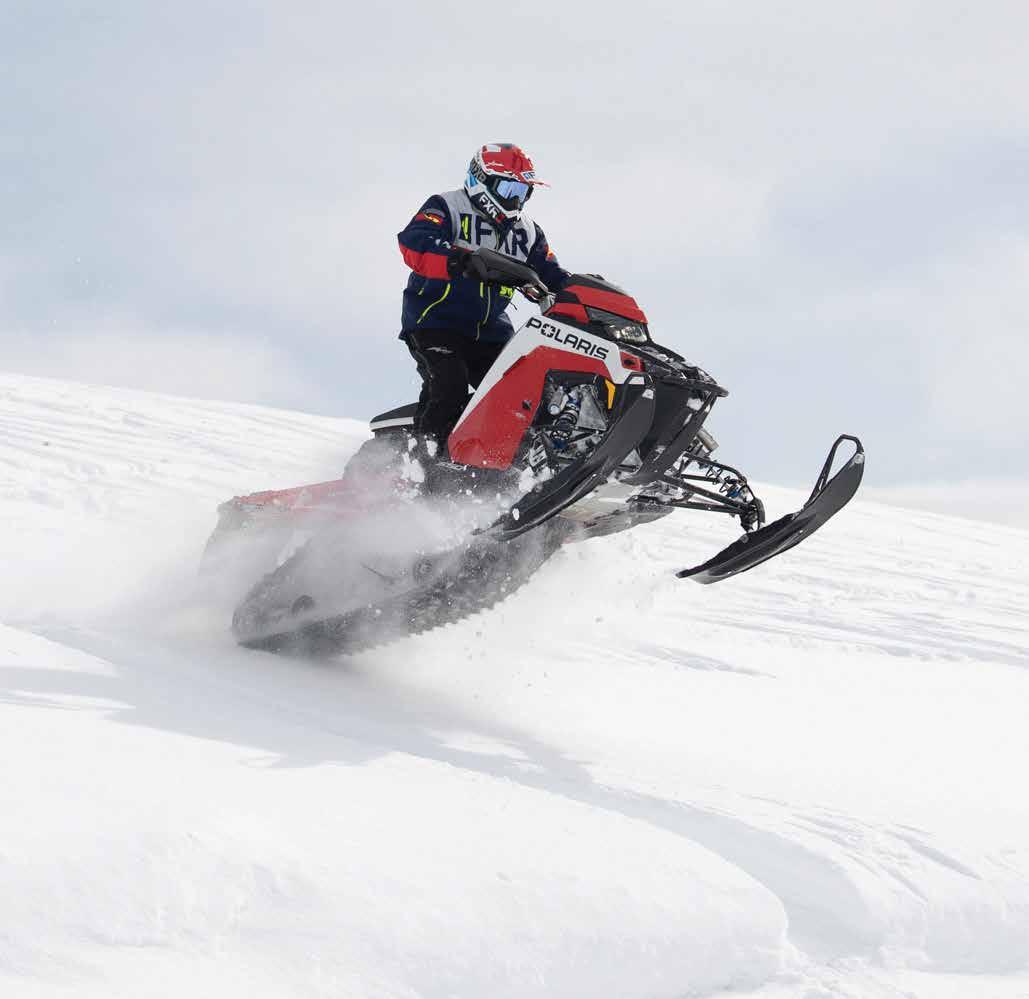Polaris really raised the bar this year with the new Matryx platform, though they didn’t apply the new chassis to the mountain sleds. We did have the opportunity to test this machine on and off trail like it was intended, and I must say, it didn’t disappoint. The fit, trim, finish on these sleds is second to none, and there are lots of cool hidden gems or ‘Easter eggs’. The Switchback Assault is now boasting a beefy set of Walker Evans Velocity shocks that can truly take a hit, and they rebound like Dennis Rodman. This, along with ride command on a 7-inch LED touch screen, helps make the 2021 Assault 146 by far the best equipped, most fun, ditch-bangin snowmobile I’ve ever thrown my leg over. – Jordan Hammack does cool powder tricks.
