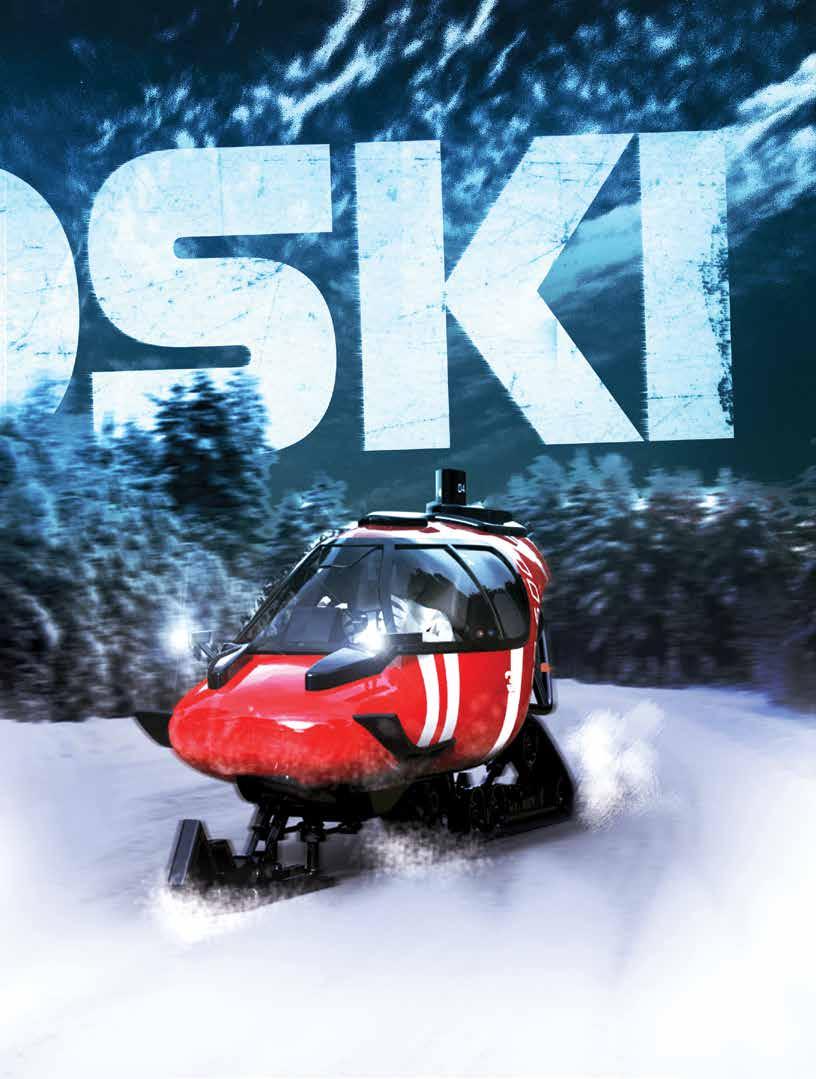 The design of the Exoski would not only have a climate controlled setting, but the vehicle itself would feature some other important features such as an advanced self balancing system that would help add to the exciting drive of the vehicle, and the futuristic design also features the Exoski using a powerful liquid cooled electric motor. This combination would allow the vehicle to not only easily navigate down the groomed trail but also would be very well suited off trail, giving the driver the opportunity to explore new areas in a different type of snowmobile, with different seating, a single ski in a climate controlled setting. While the narrow design snowmobile with a single ski is not new in the snowmobile industry, there have been numerous single ski designs like the Ski-Doo Alpine, and kits have been made available for off-road motorcycles and scooters as far back as 1990, on a Honda Cub. One of the most prominent, single ski