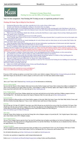 Welcome to George Mason from Parking Services and the Office of Parking & Transportation! Your 1st class assignment : Pass Parking 101! To help you out, we copied the professor’s notes. Parking 101-Some Tips to Help Get You Started 1. Parking lots fill up fast-Allow extra time, especially the 1st few weeks of class to find a space. 2. Tuesdays and Thursdays (including the evenings) are the busiest days on campus. 3. On the busiest of days, it is recommended that those arriving to campus later in the morning park at the Field House as the lots on east campus will often fill-a 15 minute walk to the Johnson Center. Also, don’t forget that general student lots permits are valid on Levels 12 of Rappahannock River Deck. 4. There’s even a free Field House shuttle that will take you from the Field House to main campus. Check out http://shuttle.gmu.edu for info on the shuttle’s hours of operation. 5. Parking permits are required to park in any lot on GMU property. 6. Always read the signs to know if a lot or area is restricted to a certain type of permit. Don’t ever park in reserved, service/repair, state vehicle and administrative spaces. 7. Parking lots are enforced all year round, including the 1st week of classes and even when classes are not in session. Don’t believe the myths and rumors about a grace period. 8. Check the parking website http://parking.gmu.edu for the latest information regarding hours of enforcement and other important news affecting parking on campus and even when classes are not in session. 9. If you’re a commuter student and want to save some money, you can park in the West Campus Lot located by the softball stadium. Parking at the West Campus Lot is only $90 for the entire year. Please note that all freshman residents will be required to park in the West Campus Lot. The new West Campus Express shuttle from West Campus Lot will run from the West Campus Lot to the Field House, to Rappahannock River Ln and then to President’s Park from 7am-1am M-F and 2pm-1am on Sunday. 10. Visitor parking is available in Mason Pond, Sandy Creek, and Rappahannock River Parking Decks, as well as metered lots. 11. Pay attention to your GMU email as students are often emailed about temporary lot closures. 12. Information about online permit sales and online citation appeals and payment options is available at http://parking.gmu.edu. 13. Reserved student permits for Rappahannock River Deck are still available! 14. Sign up for Major Event and Traffic alerts via Mason Alert https://alert.gmu.edu 15. Always contact Parking Services if you have questions or concerns! We’re located in the Parking Services building next to the Sandy Creek Parking Deck. You can also call us at 993-2710 or email us at parking @gmu.edu 16. Follow us on Twitter and Facebook at http://twitter.com/MasonParking and www.facebook.com/MasonParkingTransportation Tired of driving on the crowded area streets and highways? Want to save $$$$ instead of buying a parking permit?