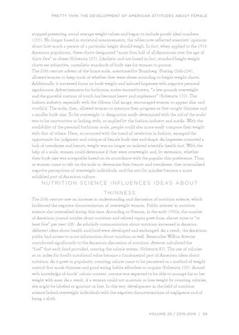 NUTRITION SCIENCE INFLUENCES IDEAS ABOUT THINNESS The 20th century saw an increase in understanding and discussion of nutrition science, which facilitated the negative characterization of overweight women. Public interest in nutrition science also intensified during this time. According to Stearns, in the early 1900s, the number of American journal articles about nutrition and related topics grew from almost none to “at least five” per year (28). As scholarly communication about nutrition increased in America, different ideas about health and food were developed and exchanged. As a result, the American public had access to more information about nutrition as well. Researcher Wilbur Atwater contributed significantly to the American discussion of nutrition. Atwater calculated the “fuel” that each food provided, creating the calorie system (Schwartz 87). The use of calories as an index for food’s nutritional value became a fundamental part of American ideas about nutrition. As it grew in popularity, counting calorie came to be perceived as a method of weight control that made thinness and good eating habits effortless to acquire (Schwartz 135). Armed with knowledge of foods’ caloric content, anyone was expected to be able to manage his or her weight with ease. As a result, if a woman could not maintain or lose weight by counting calories, she might be labeled as ignorant or lazy. In this way, development in the field of nutrition science linked overweight individuals with the negative characterizations of negligence and of being a sloth. VOLUME 25 / 2015-2016 | 39