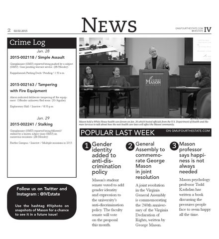Crime Log Jan. 28 2015-002118 / Simple Assault Complainant (GMU) reported being pushed by a subject (GMU). Case pending warrant service. (28/Hensley) Rappahanock Parking Deck/ Pending/ 1:50 a.m.