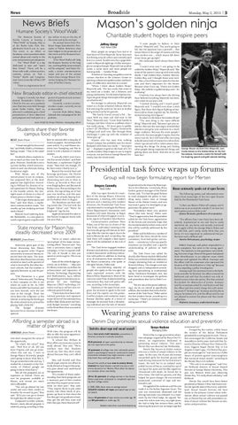Mason’s golden ninja Charitable student hopes to inspire peers Jeffrey Giorgi Asst. News Editor Many people on campus have met or at least know of Chris Mayernik. Some have seen him biking around; others just instantly spot him in a crowd. Tumblr even has a page dedicated to Mayernik sightings. Unlike most people on campus though, Mayernik has another name, a name more and more people are learning daily — Golden Ninja. Whether it’s handing out golden coins to various charities in the Johnson Center or sporting a distinctive golden jacket and backpack, it’s difficult to miss him in a crowd. “When I think about Golden Ninja,” Mayernik said, “the key words that come to my mind are a leader, not a follower, and young and fearless. It’s the kind of person trying to do great things that maybe other people are afraid to do.” No stranger to adversity, Mayernik was raised as a home-schooled military brat before entering the world on his own at 18 after being kicked out by his parents. “My family moved around a bit … because both my mom and dad were in the Navy,” Mayernik said. “I went from Seattle to Georgia, and then I lived on a sailboat when I was really young … I’d never gone to public school till [Northern Virginia Community College] and until now. But through these challenges I came up with the mindset of ‘never give up.’” Anyone who has seen him walking around campus has probably seen his stereo backpack with those very words — “never give up” — displayed in gold on the back of it. It’s a motto Golden Ninja hopes to use to inspire everyone, not just here at George Mason University, but the whole world.