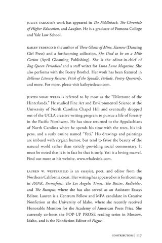 Julius Taranto’s work has appeared in The Fiddleback, The Chronicle of Higher Education, and Lawfare. He is a graduate of Pomona College and Yale Law School. Kailey Tedesco is the author of These Ghosts of Mine, Siamese (Dancing Girl Press) and a forthcoming collection, She Used to be on a Milk Carton (April Gloaming Publishing). She is the editor-in-chief of Rag Queen Periodical and a staff writer for Luna Luna Magazine. She also performs with the Poetry Brothel. Her work has been featured in Bellevue Literary Review, Prick of the Spindle, Prelude, Poetry Quarterly, and more. For more, please visit kaileytedesco.com. Justin Noah Wells is referred to by most as the “Dilettante of the Hinterlands.” He studied Fine Art and Environmental Science at the University of North Carolina Chapel Hill and eventually dropped out of the UCLA creative writing program to pursue a life of forestry in the Pacific Northwest. He has since returned to the Appalachians of North Carolina where he spends his time with the trees, his ink pens, and a surly canine named “Yeti.” His drawings and paintings are imbued with stygian humor, but tend to favor the beauty of the natural world rather than strictly providing social commentary. It must be noted that it is in fact he that is surly. Yeti is a loving marvel. Find out more at his website, www.whalesink.com. Lauren W. Westerfield is an essayist, poet, and editor from the Northern California coast. Her writing has appeared or is forthcoming in PANK, Permafrost, The Los Angeles Times, The Butter, Redivider, and The Rumpus, where she has also served as an Assistant Essays Editor. Lauren is a Centrum Fellow and MFA candidate in Creative Nonfiction at the University of Idaho, where she recently received Honorable Mention for the Academy of American Poets Prize. She currently co-hosts the POP-UP PROSE reading series in Moscow, Idaho, and is the Nonfiction Editor of Fugue. contributors | 117