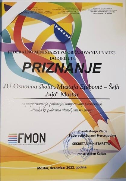 „Mustafa Ejubović - Šejh Jujo“ kao najbolji đak svoje generacije.