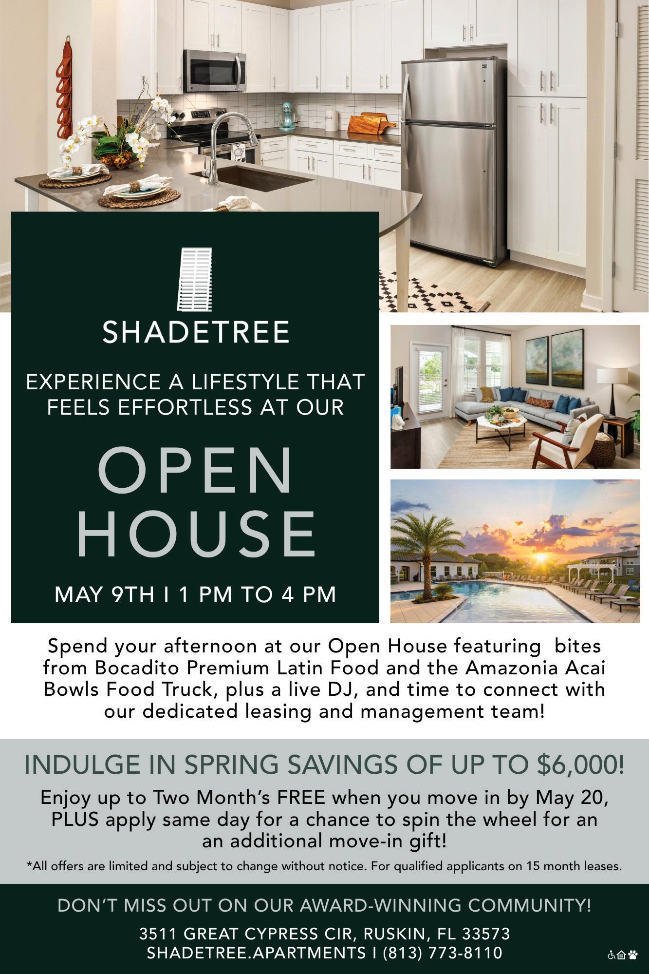 Shadetree Apartments Is More Than A Place To Live — It’s A Place To Belong From the moment you arrive, you’ll feel the sense of community that sets Shadetree Apartments in Ruskin apart. Residents enjoy fun and engaging events, on-site food trucks, and thoughtful experiences that make Shadetree a place people are proud to call home for the long term. At Shadetree, you’ll find a perfect balance of peace, comfort and connection. Every space is designed to help you slow down, recharge and truly feel at home. It’s proudly pet-friendly; with two spacious dog parks, dog water fountains, outdoor pet washing stations and plenty of room to run and play, your four-legged family members are just as welcome here as you are. Whether your lifestyle is active, laid-back, social or somewhere in between, Shadetree Apartments fits your rhythm. Schedule a tour at www.shadetree.apartments, meet its friendly team and experience firsthand why life at Shadetree isn’t just lived — it’s enjoyed.