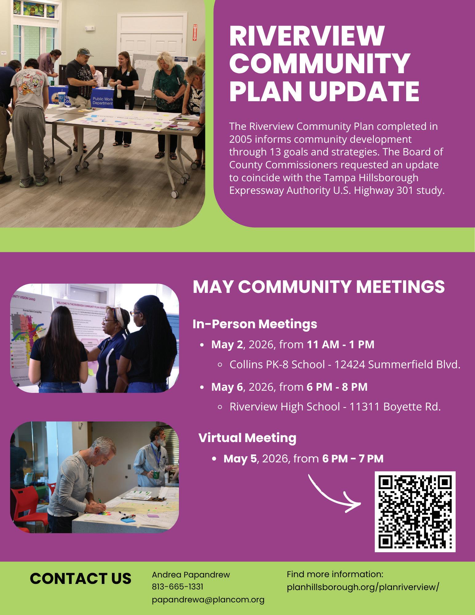 • Tuesday, May 5, 6-7 p.m., via a virtual meeting. Register using the QR code or go to the project website. • Wednesday, May 6, 6-8 p.m., at Riverview High School, located at 11311 Boyette Rd. in Riverview. For more information on the Riverview Community Plan update, please visit the project website; https://planhillsborough.org/planriverview/. Thank you to the Riverview commu -