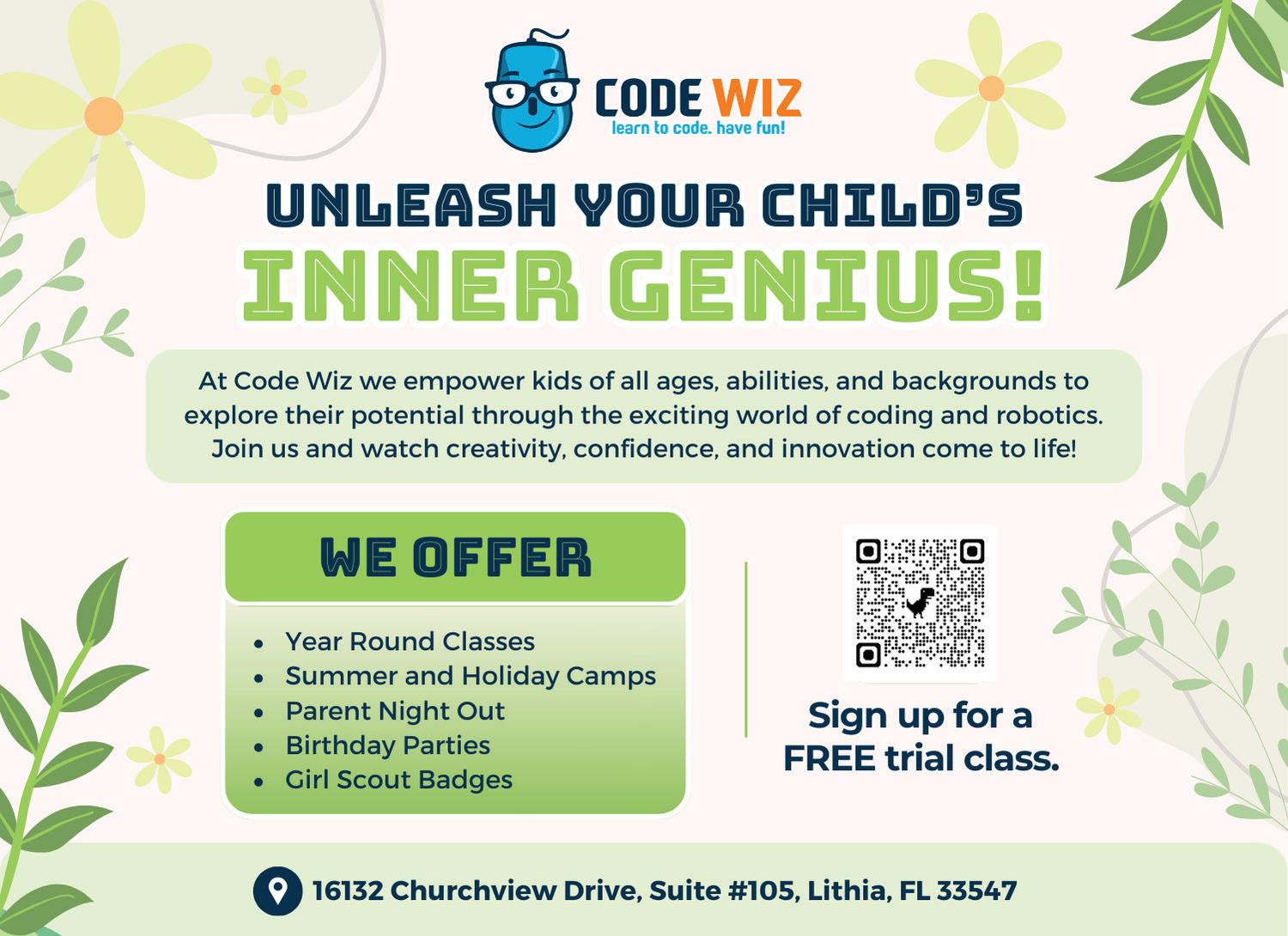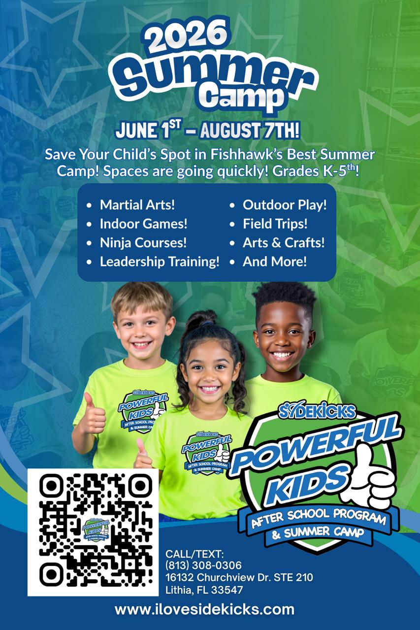 Code Wiz, located at 16132 Churchview Dr., Ste. 105, in Lithia, teaches coding and robotics to children, its camps are hands-on, student-driven and designed to foster curiosity and independence. Campers are encouraged to explore, problem-solve and create at their own pace, with guidance from coaches to support their individual learning journeys. Camps will run throughout the summer and are available for mornings, afternoons or full days. Visit online at www. codewiz.com/ fishhawk-fl.