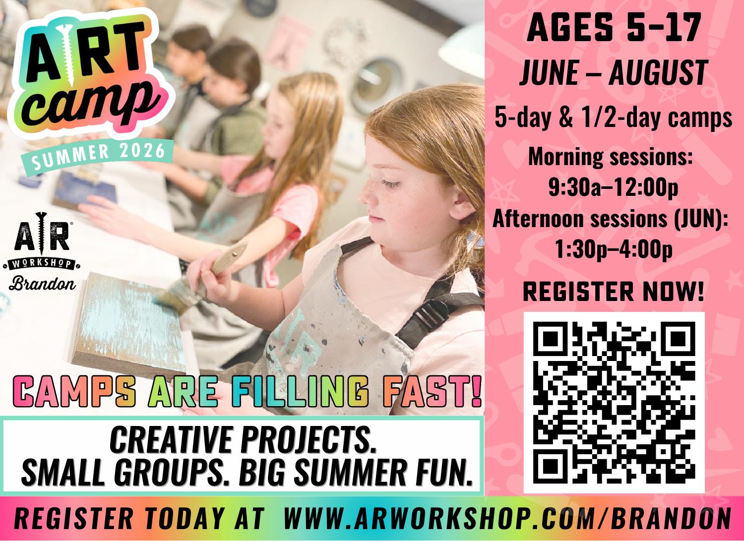 AR Workshop is a craft studio offering hands-on classes for campers ages 5-17. The handson classes are designed to inspire creativity, confidence and fun in a supportive studio environment. Both full and half-day camps are available at its location in Valrico at 1046 Bloomingdale Ave. Visit its website at www.arworkshop.com/ brandon for more information and to register.