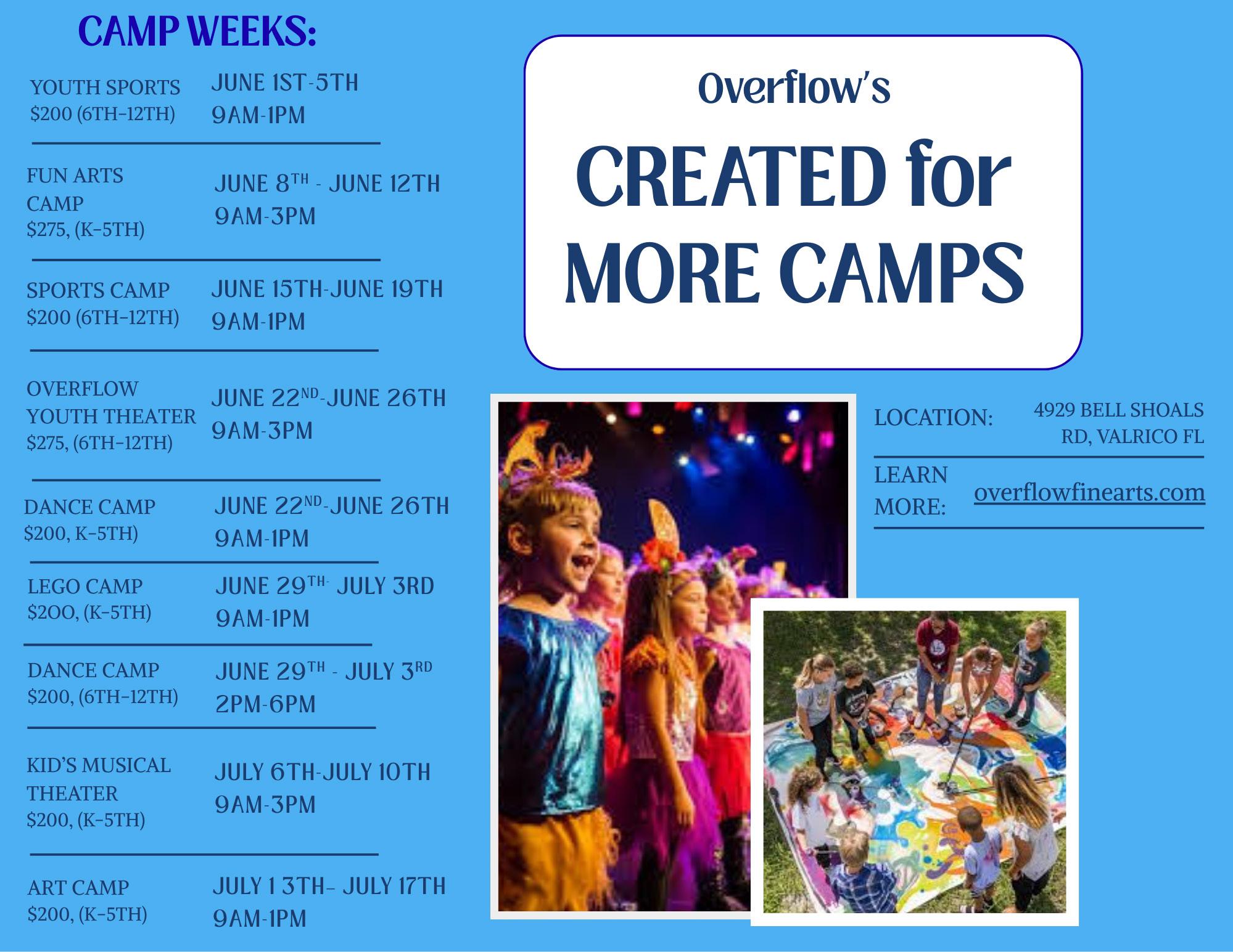 Overflow Fine Arts Camp is located at 4929 Bell Shoals Rd., in Valrico and will provide a wide variety of camps over the summer including a dance camp, kids musical theatre camp, art camp and lego camp. The emphasis at these camps will be on feeling safe and belonging, with a low ratio of teachers to campers. Camps will run from June 1 through July 17. Most camps will start at 9a.m. and will run through 3p.m.