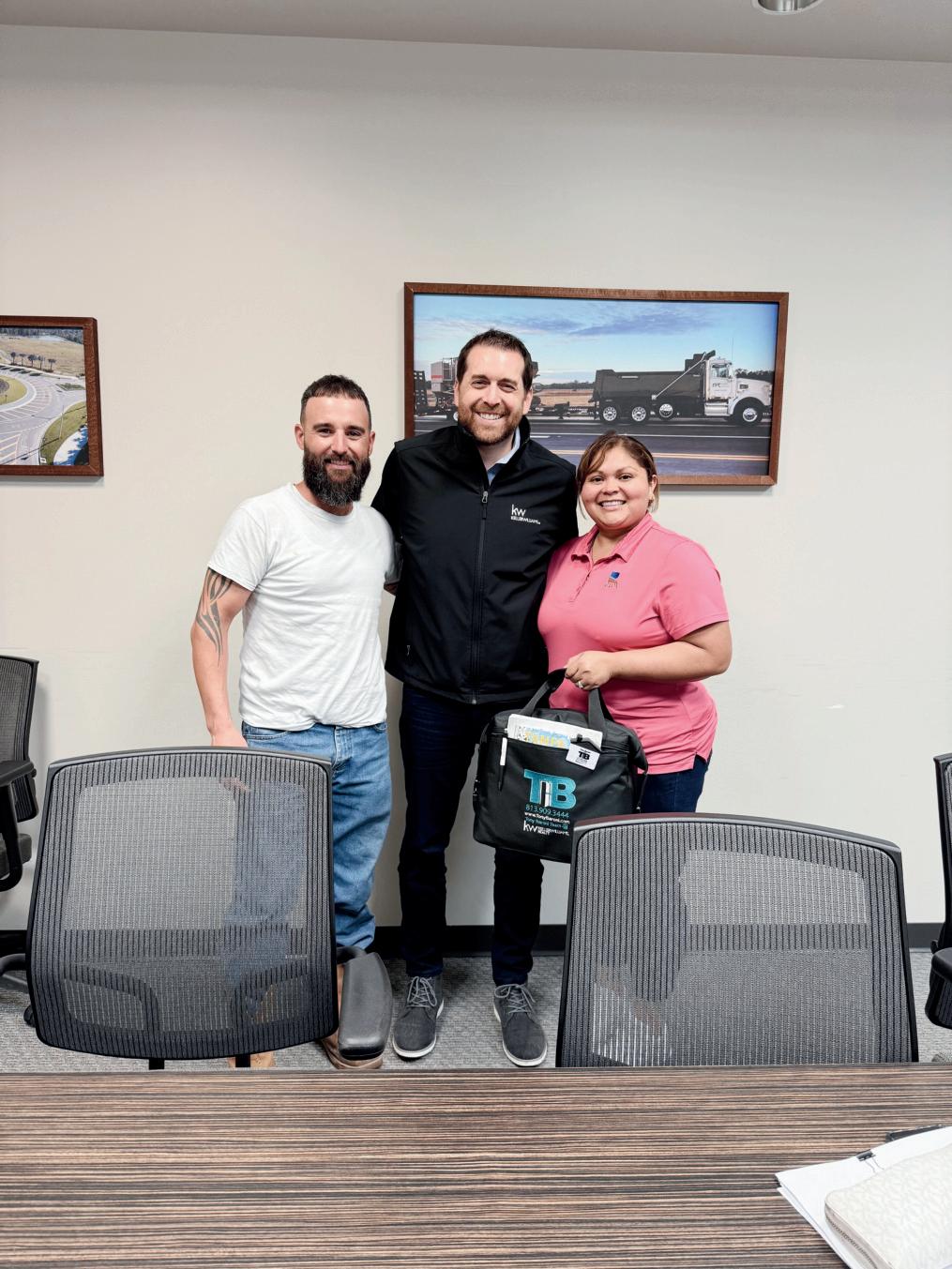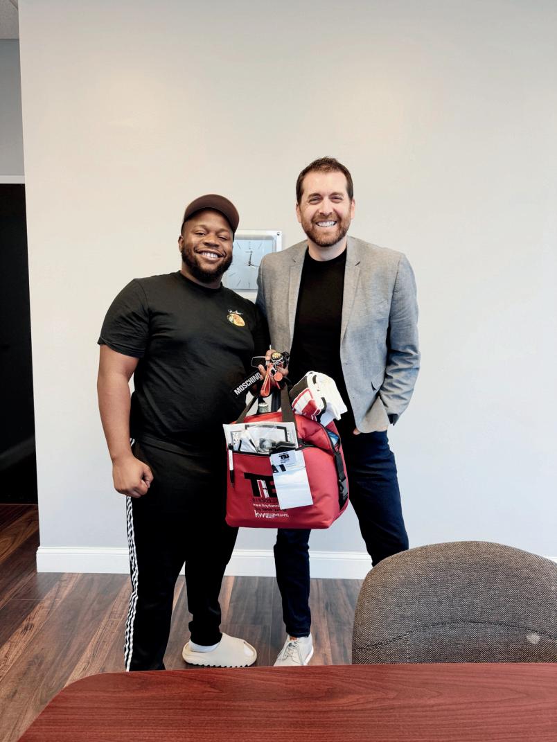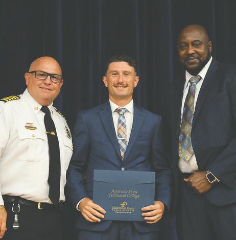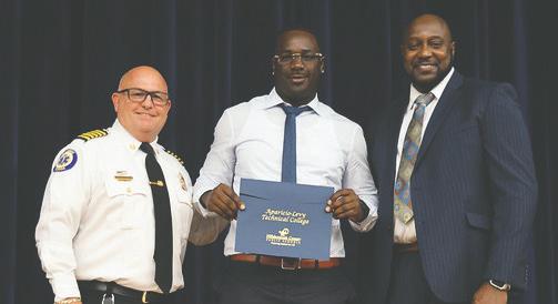 Tarean Austin (center) graduated from the fire academy. Fire Chief Jason Dougherty (left) and Jesse Salters (right) principal of Aparicio-Levy Technical College.