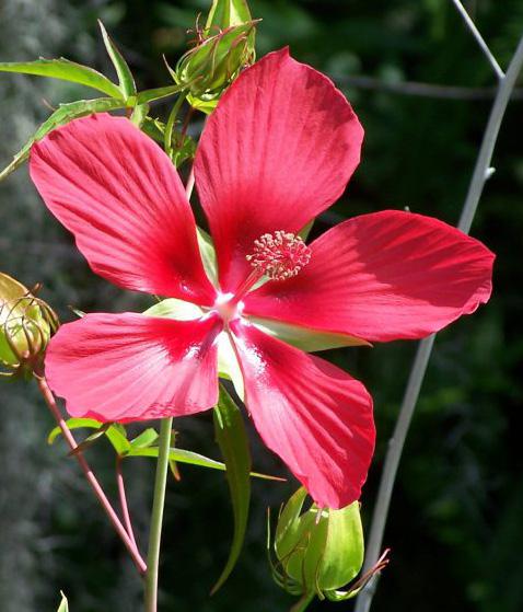 Swamp hibiscus, also known as scarlet rosemallow or Hibiscus coccineus , which is native to Florida and the southeastern U.S., produces amazingly beautiful red flowers. We have this plant on the bank of our lower pond in the Bette S. Walker Discovery Garden, located in the courtyard of the Extension office. This plant can reach a height of 15 feet.