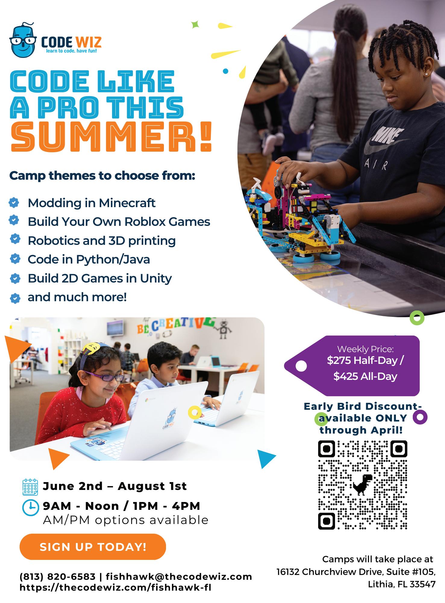 Code Wiz, located at 16132 Churchview Dr., Ste. 105, in Lithia, teaches coding and robotics to children, its camps are hands-on, student-driven and designed to foster curiosity and independence. Campers are encouraged to explore, problem-solve and create at their own pace, with guidance from coaches to support their individual learning journeys. Camps will run throughout the summer and are available for mornings, afternoons or full days. Visit online at www. codewiz.com/fishhawk-fl.