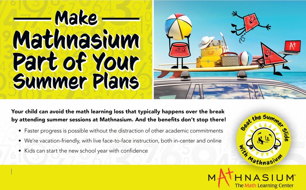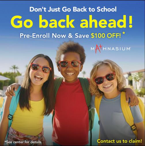 Summer is the perfect time for kids to grow in confidence and strengthen math skills without pressure. At Mathnasium, summer learning accelerates with personalized plans designed for every stage — from building foundations to tackling advanced challenges. Students receive targeted support, stay sharp or move ahead while enjoying engaging, flexible sessions that fit busy summer schedules. Parents often see gains not just in skills but also in confidence and attitude. This summer, help your child return to school prepared, motivated and excited about math. To find a location near you, please visit www. mathnasium.com.