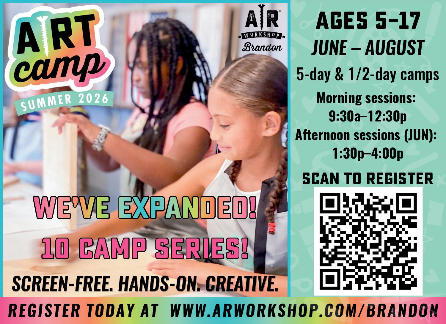 AR Workshop is a craft studio offering handson classes for campers ages 5-17. The handson classes are designed to inspire creativity, confidence and fun in a supportive studio environment. Both full and half-day camps are available at its location in Valrico at 1046 Bloomingdale Ave. Visit its website at www.arworkshop.com/brandon for more information and to register.
