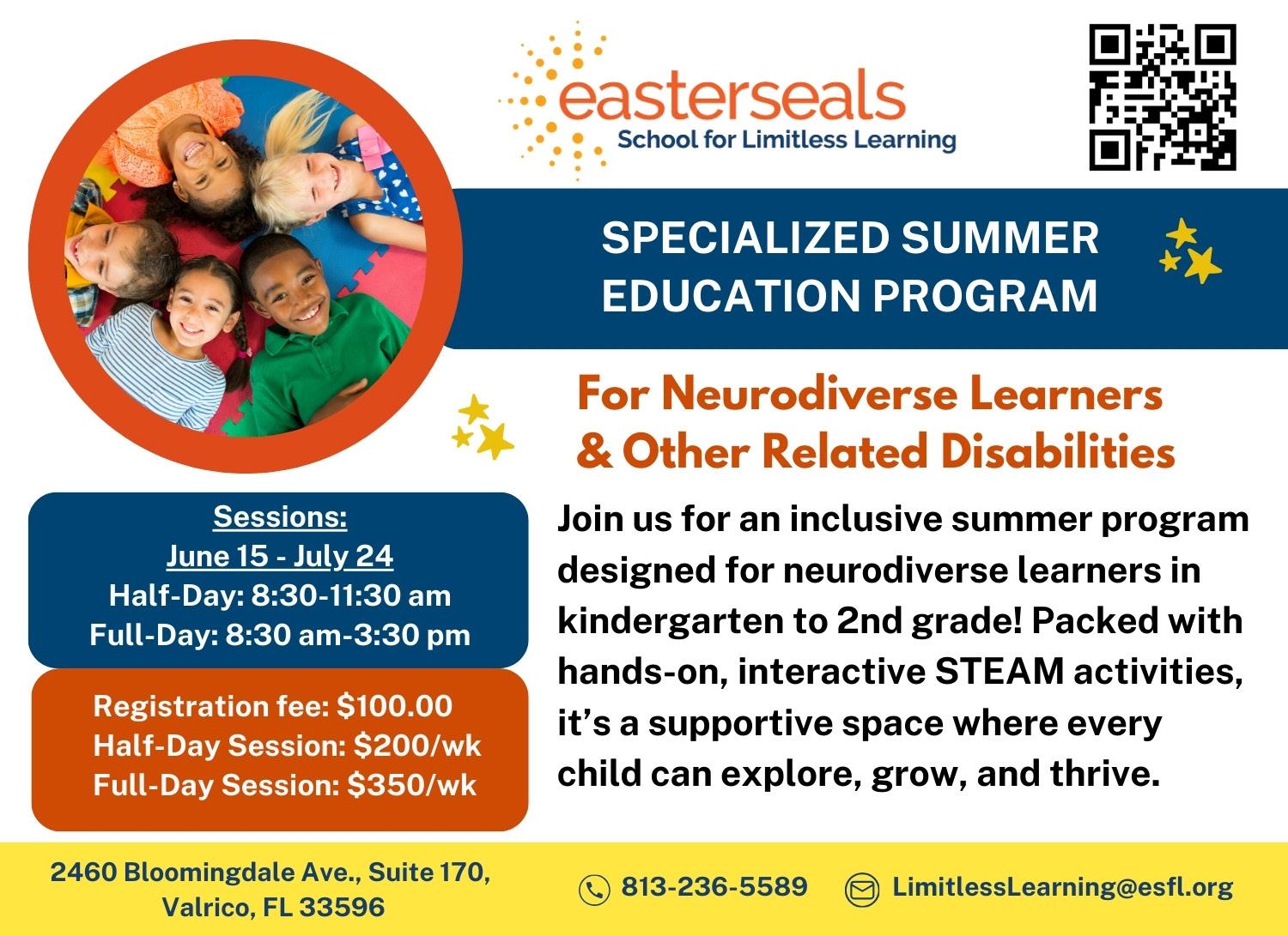 Easterseals School For Limitless Learning — Inclusive Summer Camp For Neurodiverse Learners Get ready for an exciting and inclusive adventure designed specifically for neurodiverse young learners and those with other disabilities in kindergarten through second grade. Packed with hands-on and interactive STEAM activities, it’s a supportive space where every child can explore, grow and thrive. The Easterseals School for Limitless Learning is located at 2460 Bloomingdale Ave., Ste. 170, in Valrico, and the summer camp is available for six weeks from Monday, June 15, to Friday, July 24, with morning, afternoon and all-day sessions available. Visi tits website at https:// florida.easterseals.com/ get-support/areas-of-support/early-childhood-care/easterseals-school-for-limitless-learning.