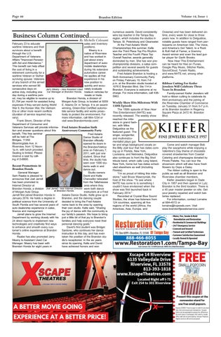 February 23 to educate sales and inventory wartime Veterans and their positions. survivors about a benefit Meany is a through the U.S. native of Riverview Department of Veterans and has worked in Affairs "Improved Pension just about every with Aid and Attendance." department of autoThis benefit can help offset mobile dealerships the cost of living in a during his extensive retirement community for a automotive career. wartime Veteran or his/her He applies all that experience in his surviving spouse. Veterans new position to of any branch of the armed quickly and accuservices who served 90 rately evaluate consecutive days on Jerry Meany - new Assistant Used Car Manager at Brandon Honda. trade-in vehicles for active duty, including one day during a wartime periresale or trade. od, may be eligible to receive up to Brandon Honda, a division of $1,794 per month for assisted living Morgan Auto Group, is located at 9209 expenses if they served during World E. Adamo Dr. in Tampa. It is an awardWar II, the Korean War, the Vietnam winning, Green-Star Certified automoEra or other more recent conflicts bile service facility and works proac(duration of service required may tively to protect the environment. For vary). more information, call 664-1234 or Frank Strom, Director of the visit www.BrandonHonda.com/. Department of Consumer and Veterans Services will provide informa- Fred Astaire Brandon Sixth Anniversary Community Party tion and answer questions about this benefit. This free seminar Fred Astaire will be held at The Dance Studio of Bridges, 11350 Brandon officially Bloomingdale Ave. in opened its doors in Riverview, from 12 Noonthe Brandon/Valrico 1p.m. with lunch provided. area on February 7, Seating is limited. Please 2011, with just one reserve a seat by callstudent. Since that ing 413-8900. time, the studio has seen over 1000 stuRecent Promotions At dents walk in and Brandon Honda dance out. General Manager Studio owners Sam Raabe is pleased to David and Kelle announce that Joel Jarrell Chancellor relocated has been promoted to from the Tallahassee Internet Director at area where they Brandon Honda, a division Joel Jarrell - new Internet Director were both dance at Brandon Honda. of Morgan Auto Group. instructors at a Fred Jarrell first joined Brandon Honda in Astaire Dance Studio. Kelle grew up in January 2016. He holds a degree in Brandon, and the dancing couple political science from the University of decided to bring the Fred Astaire South Florida and has several years of name back to the area by opening auto dealership experience in sales, their own studio. Kelle said, “Sharing finance and management. the joy of dance with the community is Jarrell plans to grow the Internet our family’s passion. We hope to bring Department by working closely with his just a little bit of that joy to Brandon’s 24 direct reports to implement new families and help everyone meet their technologies and creatively find ways personal dancing goals.” to enhance and smooth every cusDavid’s first student was Bridget tomer’s online experience at Brandon Sardone, who continues her dance Honda. instruction to this day, and has even Raabe has also promoted Jerry taken the position of the Brandon stuMeany to Assistant Used Car dio’s receptionist. In the six years Manager. Meany has been with since its opening, Kelle and David Brandon Honda for eight years in have achieved honors and won