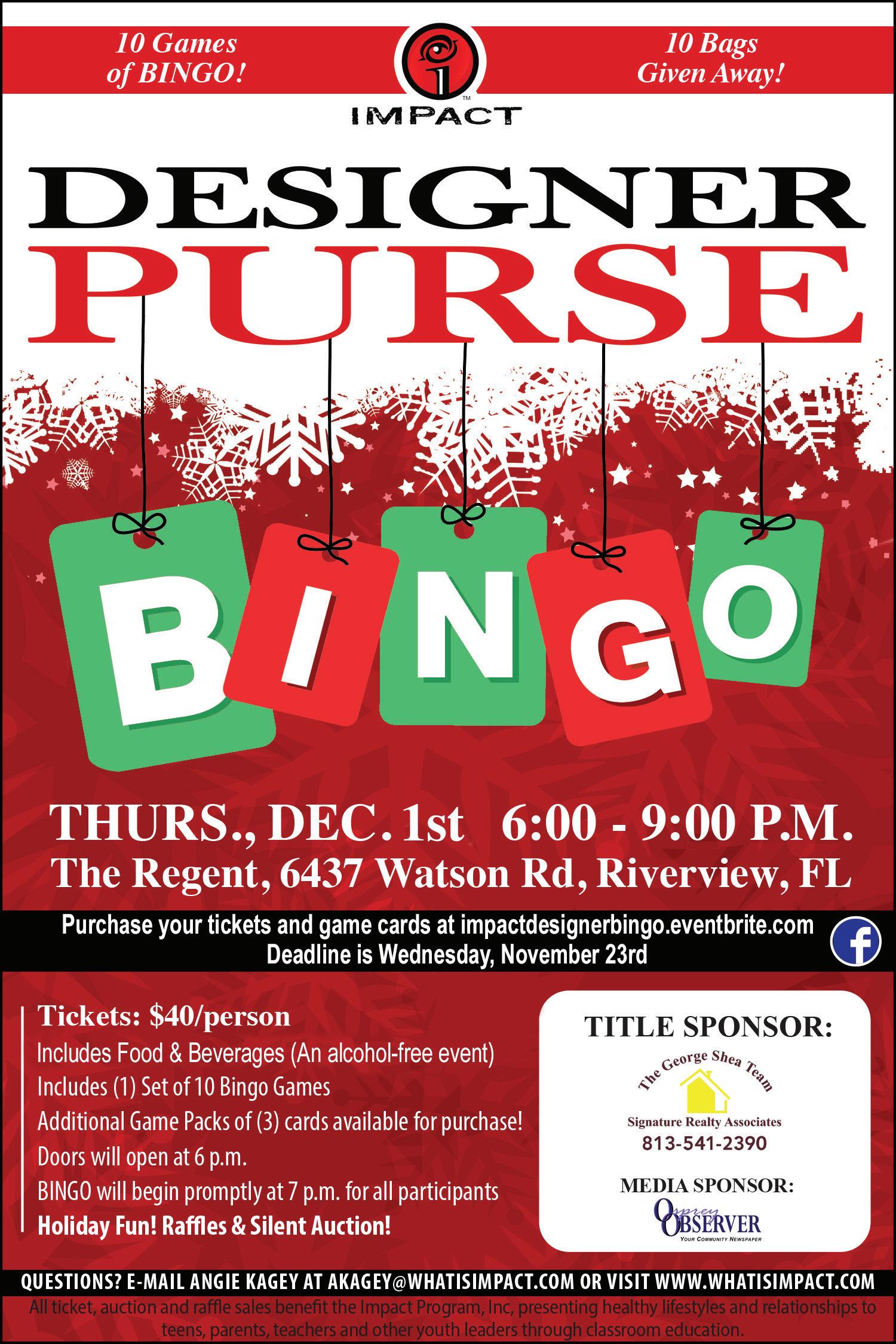 Are you looking for a fun and delicious way to get into the holiday spirit while helping a local char ity raise important funds? Then mark your calendars for Thursday, Decem ber 1 because the IMPACT program is hosting a holiday de signer purse bingo.