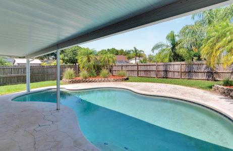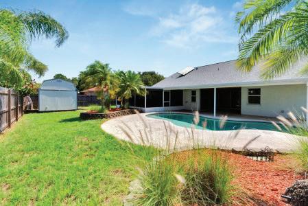For sale in Riverglen, this 4/3/2 pool home stands out before you even get inside because of its new roof & fenced back yard with a variety of spaces for Florida living! The pool is surrounded by a stamped concrete deck with both open & roofed areas for all-weather enjoyment, including a 400-SF screened lanai & a wood-walled retreat of 100 SF accessible by sliders from both of the main living rooms. The lanai is set up with a hot tub featuring stacked facade; the privacy-fenced yard is gated on each side; & a big storage shed can handle all your equipment (plus more) for maintaining the landscaped 1/4 acre. No carpet in this 2,050 SF, only tile & wood laminate floors. $475,000