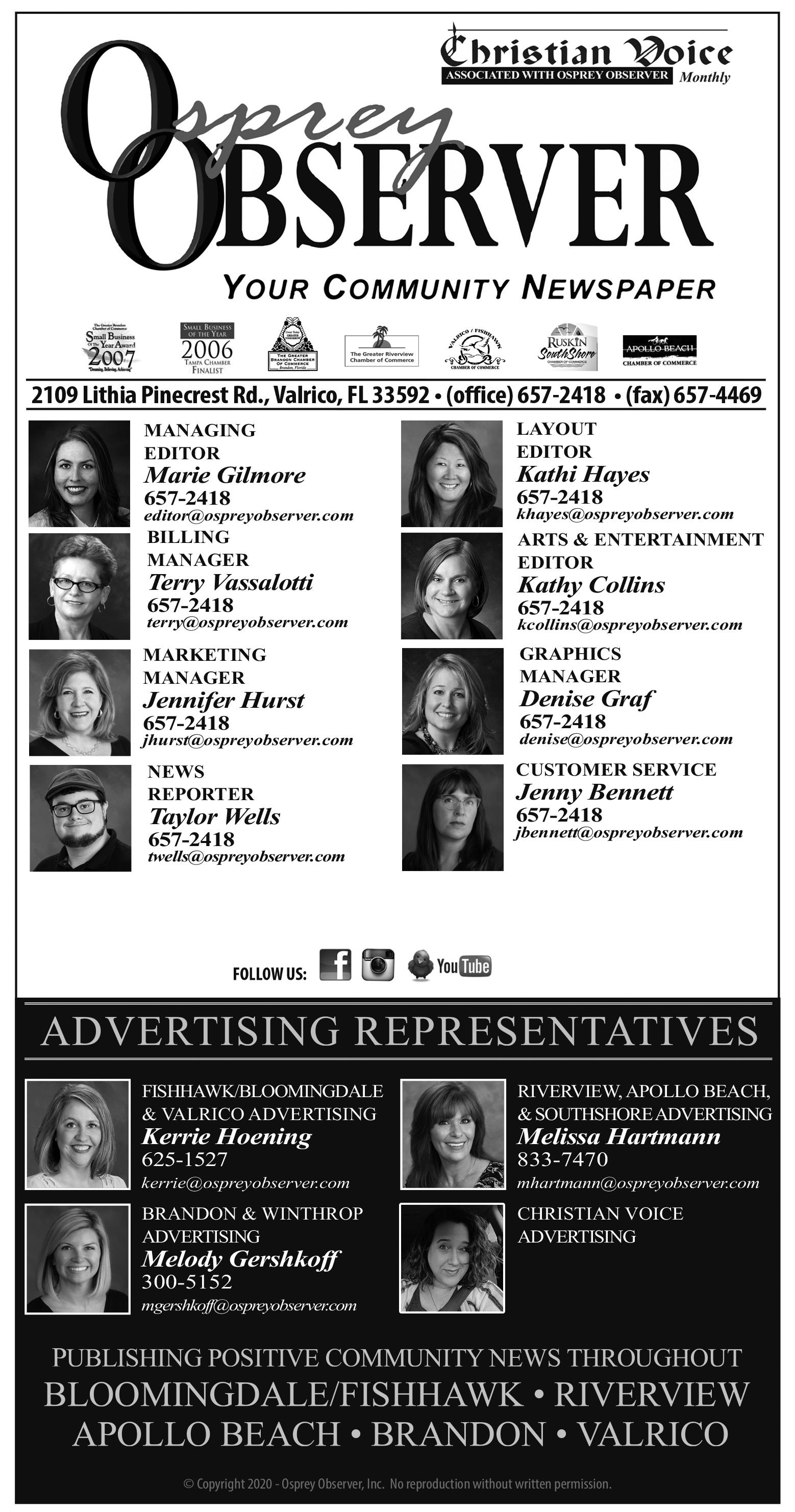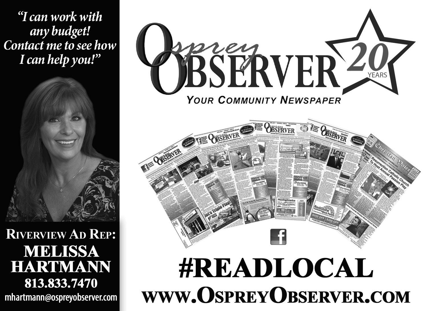 CELEBRATING 21 YEARS OF PUBLISHING POSITIVE COMMUNITY NEWS Osprey Observer 2109 Lithia Pinecrest Rd. Valrico, FL 33596 ECRWSS EDDM Postal Customer PRSTD STD U.S. POSTAGE PAID TAMPA, FL PERMIT #2118 July 2023 Volume 21, Issue 7 Ph: 813-657-2418 Riverview/Apollo Beach 46
