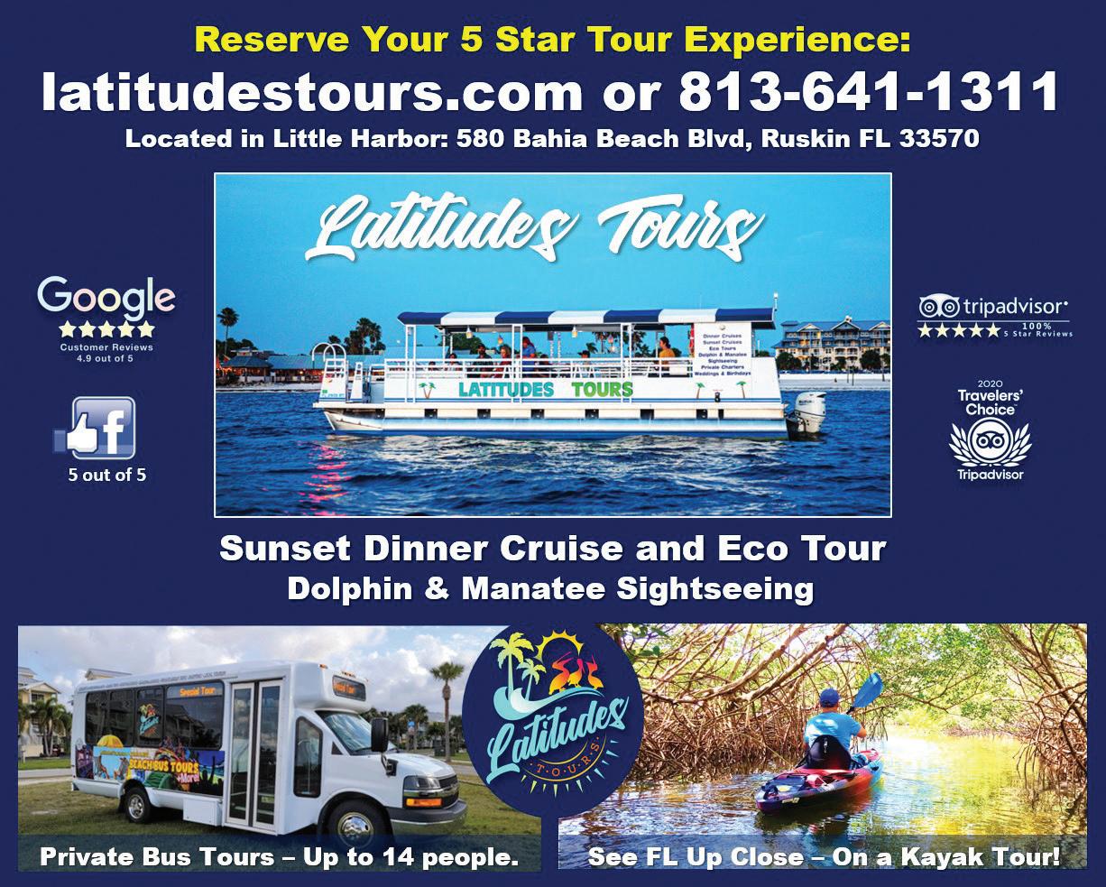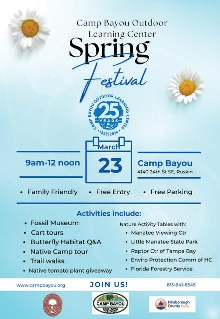 While you are marking your calendar, save the date, Saturday, April 13, for a night paddle to explore the Little Manatee River after dark — without flashlights. Canoes and kayaks are available for $25 per boat; it costs $5 if you have your own vessel. Plan to arrive by 7 p.m. to be out on the water by 7:30 p.m. Registration is required; email campbayou@gmail.com or call the ofce 813-641-8545. Camp Bayou continues to ofer day paddle trips on the first and third Saturdays of each month at 9 a.m.; reservations are required.