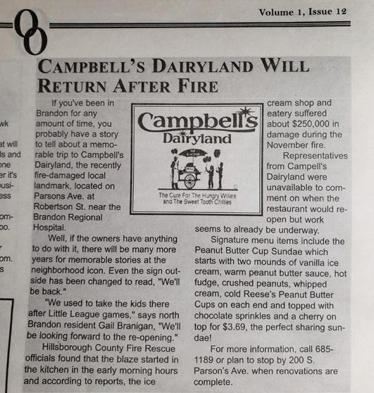 On November 8, 2002, Campbell’s Dairyland, co-owned by Jay Paules, Jill Paules, Leesa Lee and James Lee, suffered fire damages totaling around $250,000, which the Osprey Observer covered in our December 2002 FishHawk edition. Jay was alerted of the fire at around 1 a.m. and rushed to his restaurant, but the damage was done.