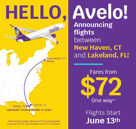 Avelo Airlines announced exclusive nonstop service between Lakeland International Airport (LAL) and Southern Connecticut’s most convenient airport — Tweed-New Haven Airport (HVN).
