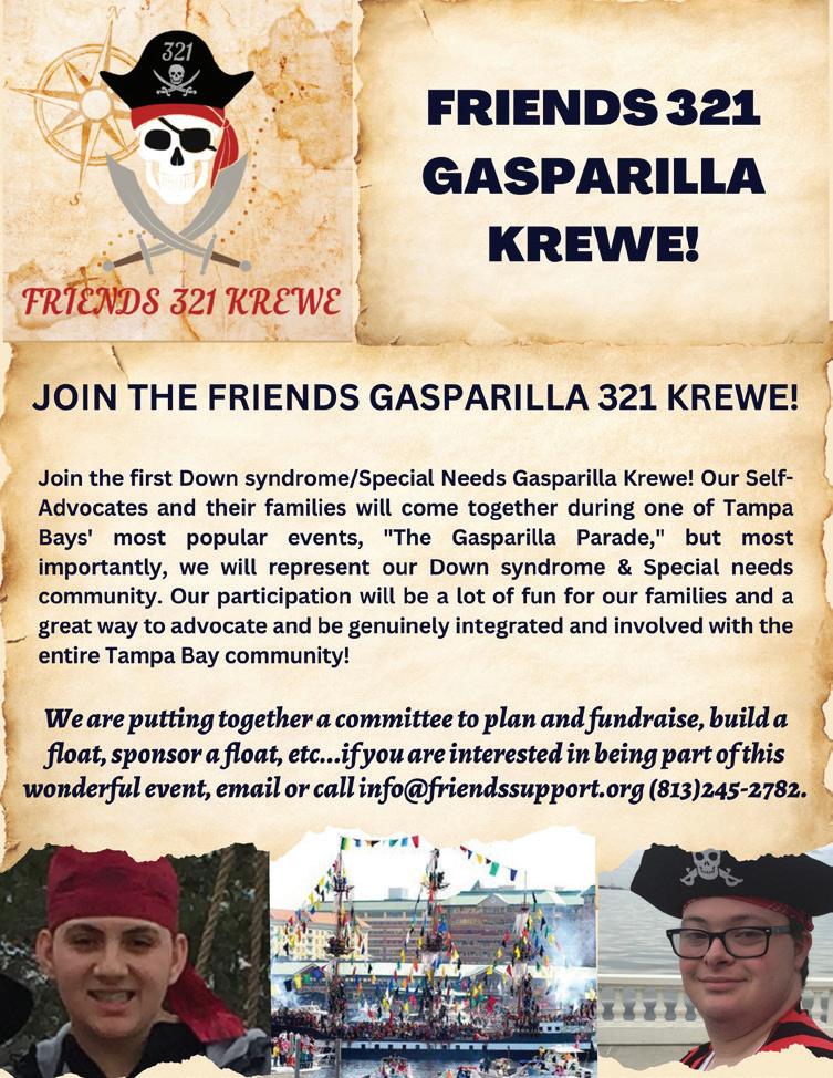 The Gasparilla 321 Krewe was started this year with hopes of F.R.I.E.N.D.S. having its own float for over 100 members with Down syndrome or other special needs. The Krewe is named 321 to represent the third copy of the 21st chromosome that leads to Down syndrome.