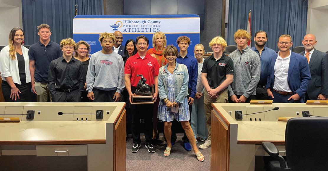 Bloomingdale High School wrestling coach Mark Church was named this year’s Joel Medgebow Memorial Wrestling Coach of the Year. He was presented the award at the Hillsborough County School District meeting on March 30. The award is given yearly to honor the memory of Robinson High School wrestling coach Joel Medgebow.