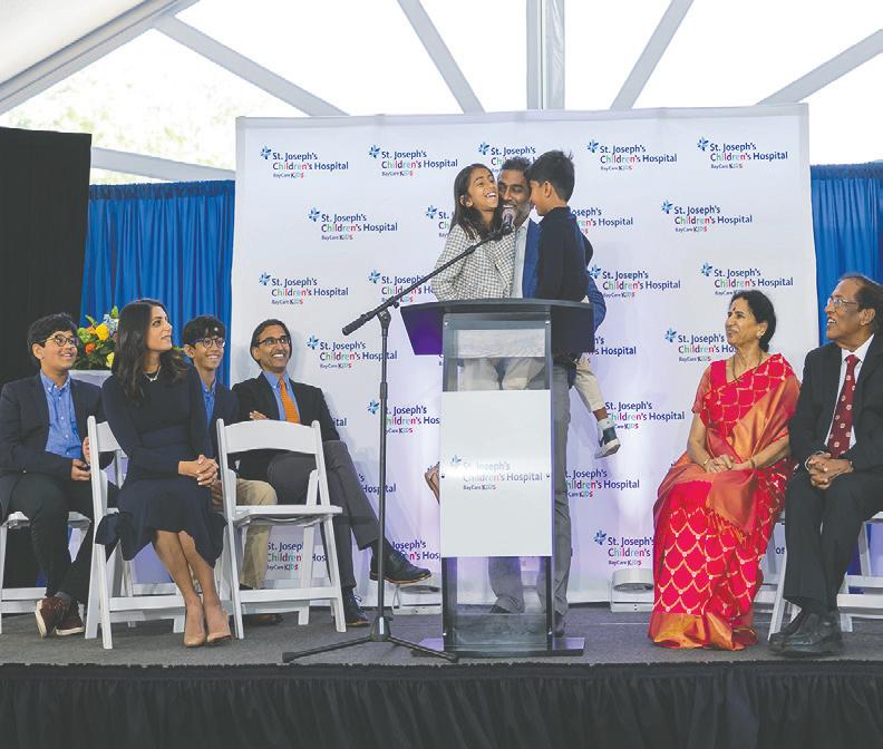 St. Joseph’s Children’s Hospital Foundation recently announced a $50 million gift from the Pagidipati family of Tampa to support the future of pediatric health care in the Tampa Bay community. Tampa business leader and philanthropist Sidd Pagidipati, along with his brother, Rahul, and sister, Srujani, make this transformative donation to honor their parents’ legacy as health care providers, their 50th wedding anniversary and their 50th anniversary of coming to the United States. The Pagidipatis’ generosity is one of the largest donations in Tampa Bay history and one of the largest gifts to health care in Florida. The gift will support the new, specially designed pediatric facility for St. Joseph’s Children’s Hospital, which BayCare announced in October 2023 as part of a strategic efort to increase the region’s access to high-quality, state-of-the-art health care for children.