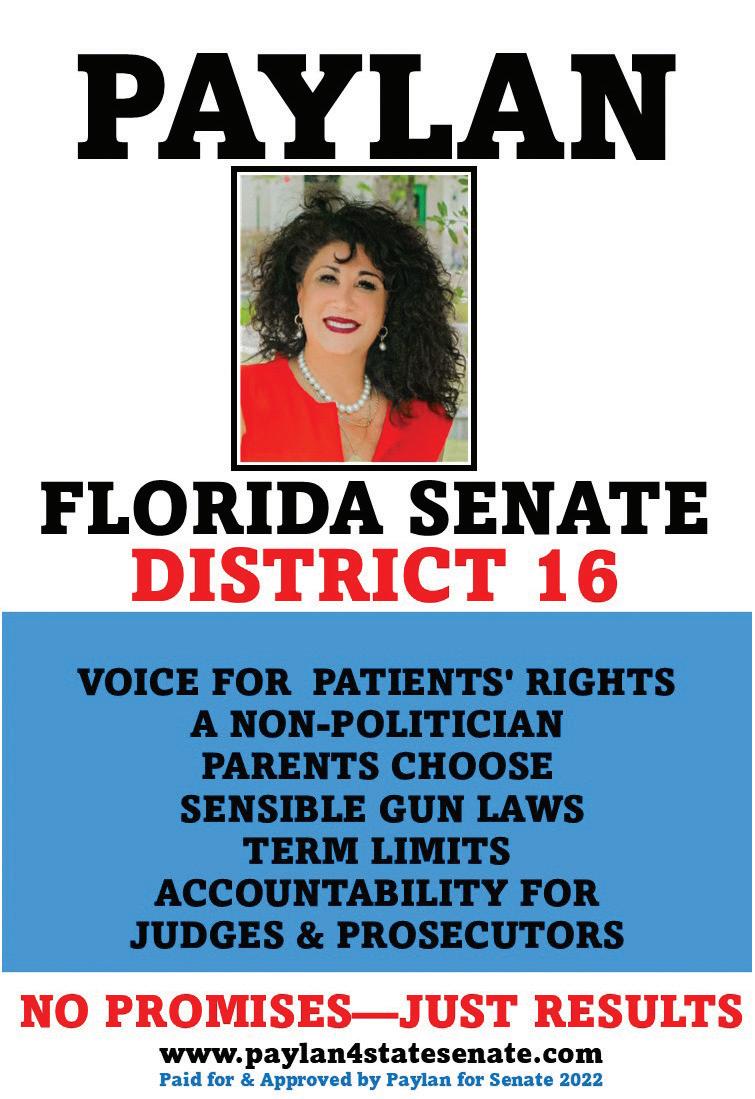 For more on her position on issues, you can directly reach her at 813-919-6299 or visit her website at www.paylan4sta tesenate.com.
