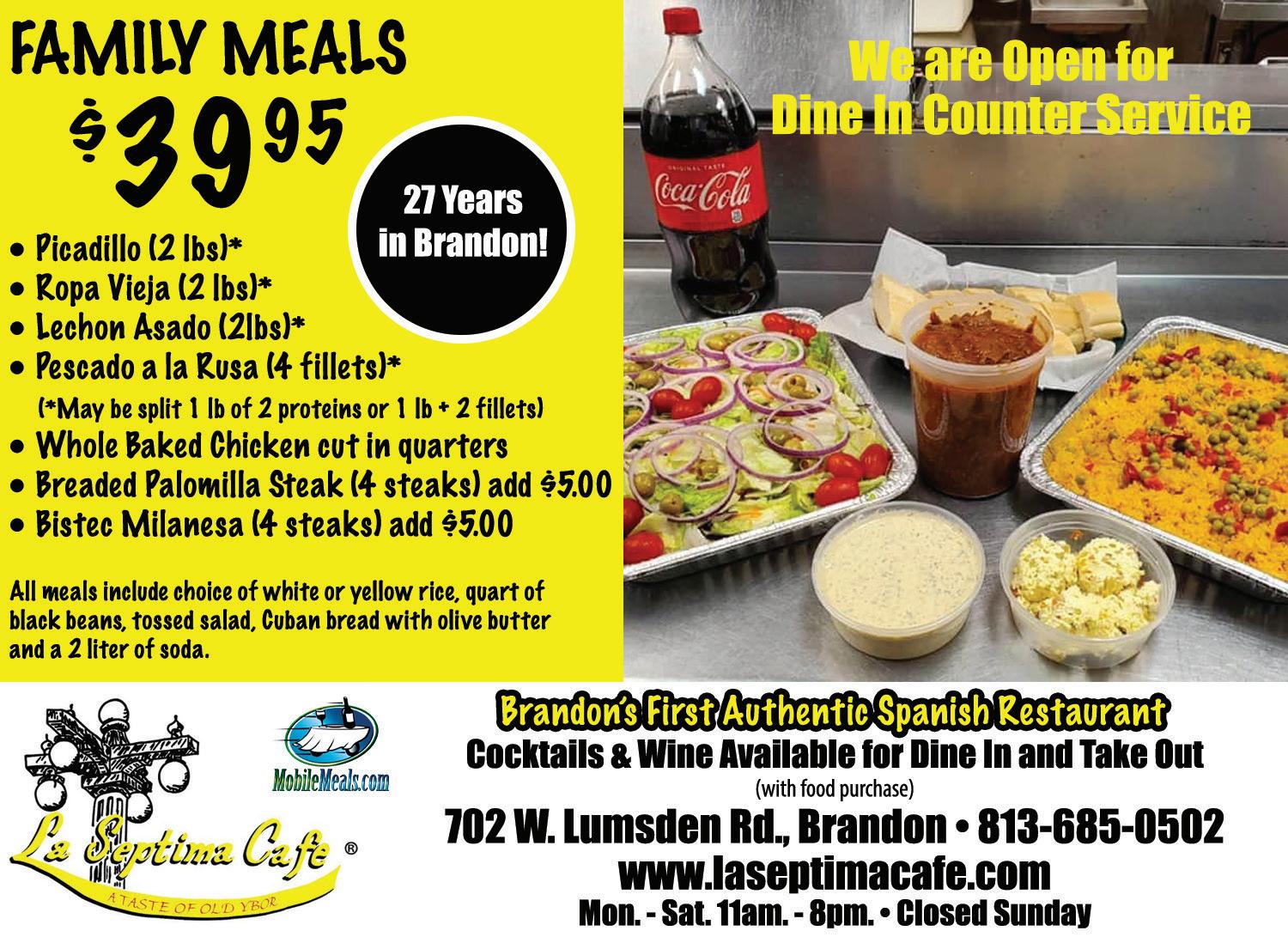 Rosati’s Pizza in Valrico, located at 3437 Lithia Pinecrest Rd, is open for carryout, delivery and catering. Its hours are Sunday through Thursday, 11 a.m.-10 p.m., and Friday and Saturday from 11 a.m. to 11 p.m. Stop by daily between 11 a.m.-3 p.m. for Rosati’s ‘Jumbo Slice and a Soda’ $6.50 special. For more information, visit www. rosatispizza.com/location/valrico-fl/ or call 813-643-1003.