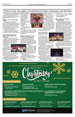 Christmas Lane returns to the Strawberry Festival Fairgrounds on Friday, November 23and will take place until December 24 inside and around the Charlie Grimes Family Agriculture Center, 2508 W. Oak Ave. in Plant City. Celebrate 35 years of extraordinary displays featuring over 1.5 million lights adorning over 200 Christmas trees accompanying its larger-thanlife decorations and using more than 180,000 watts of power. Santa will be there each night. Concessions (hamburgers, fries, popcorn and more) and a Christmas Lane gift shop available. Living Nativities will be held