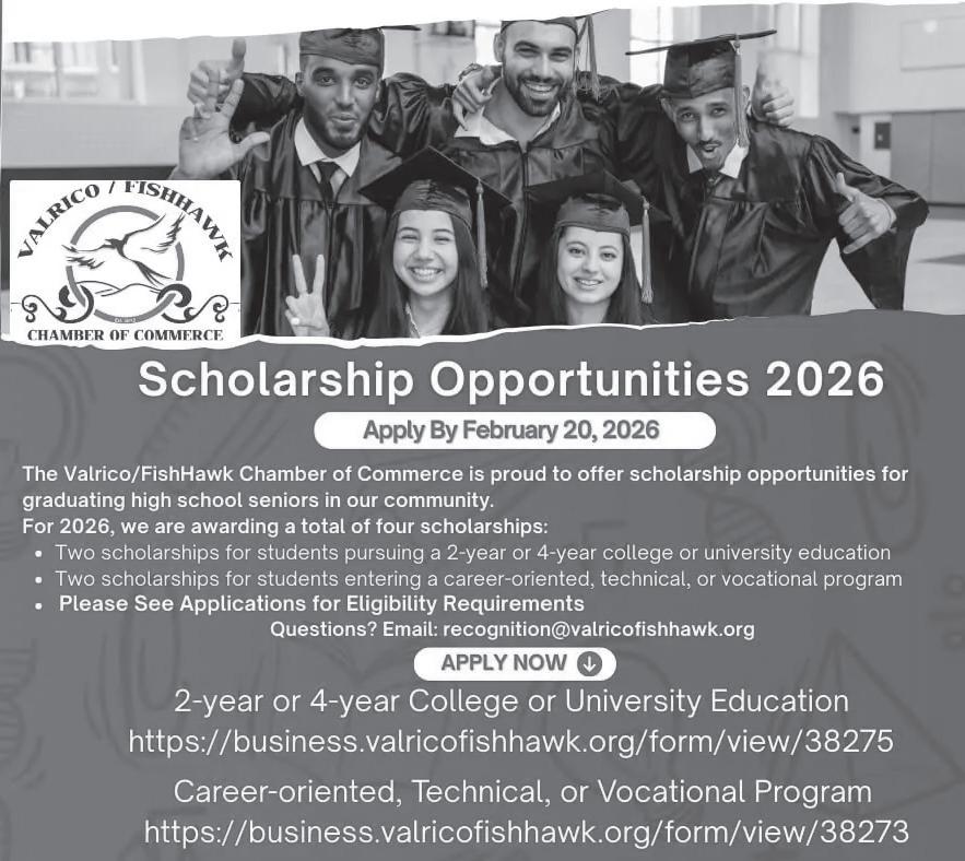 The Valrico Fishhawk Chamber of Commerce (VFCC) works year-round to raise funds for a Charity of Choice (selected by the Board President), collect donations for its high school senior scholarship program for students entering a trade school, and give back to our schools with a great teacher luncheon and donated school supplies.