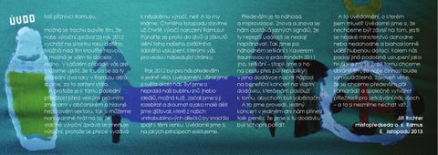k nějakému výročí, ne? A to my máme. Čtvrtého listopadu slavíme už čtvrté výročí narození Ramusu! Ponořte se proto do divů a zákrutů dění toho našeho zvláštního lidského uskupení, kterými vás provedou následující stránky. Rok 2012 byl pro nás především o jedné věci. Uvědomění. Všimli jsme si světa okolo nás. Byť jsme si nepraskli naši bublinu snů (nebo ideálů, možná iluzí), začali jsme si ji rozebírat a zkoumat a jako malé děti jsme zjišťovali, které z našich vnitrobublinových dílečků by snad šlo spojit s těmi venku. Uvědomili jsme si, na jakých principech existujeme.