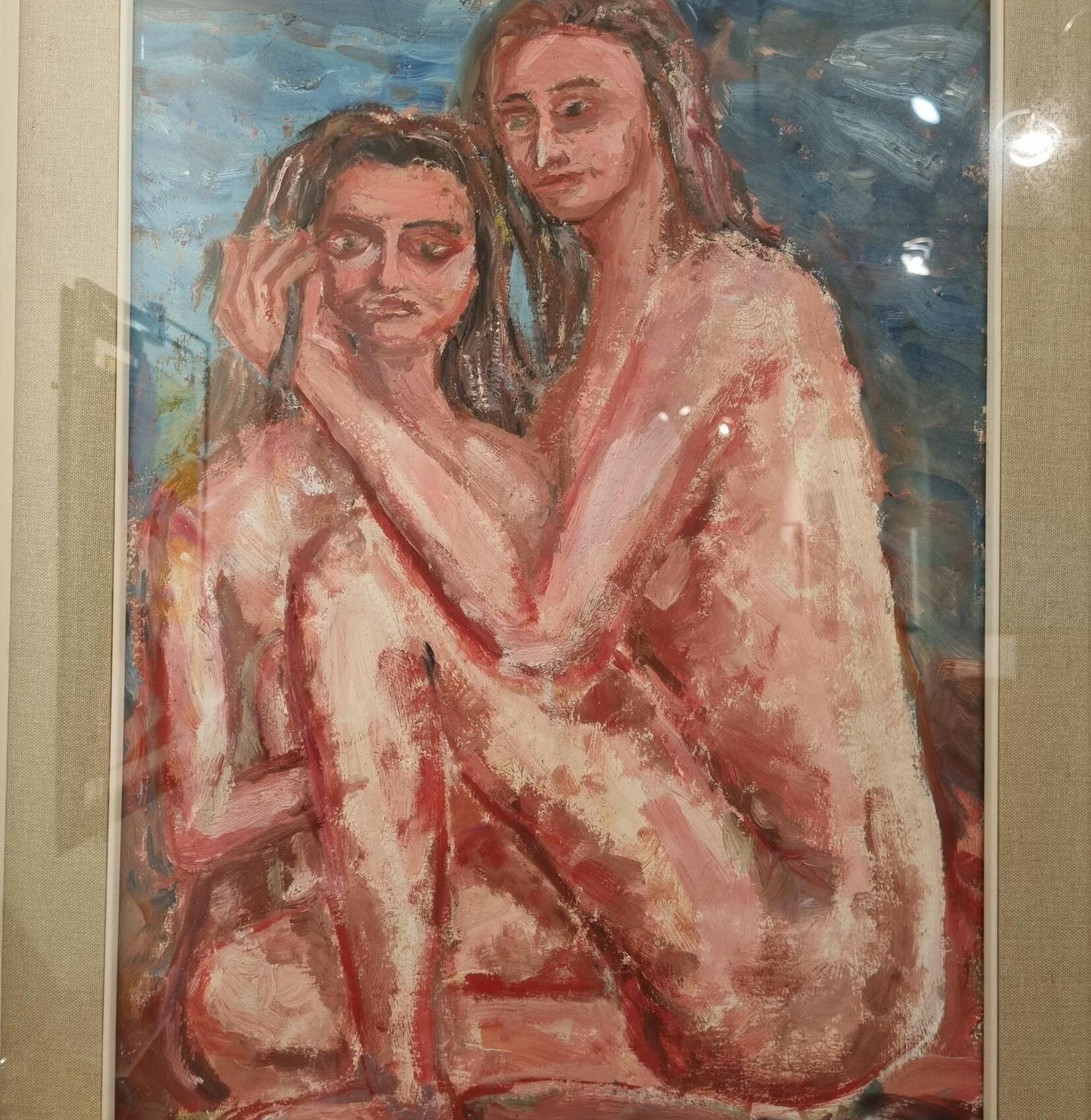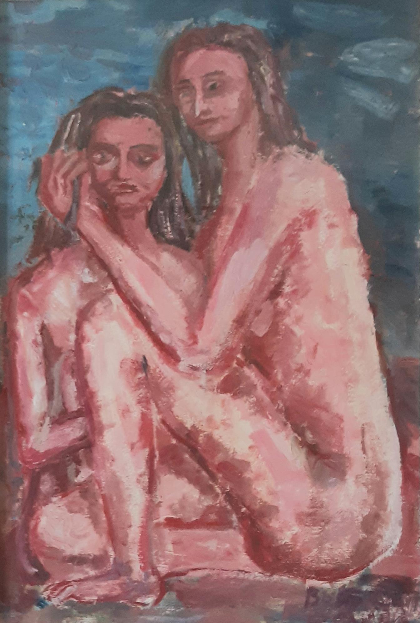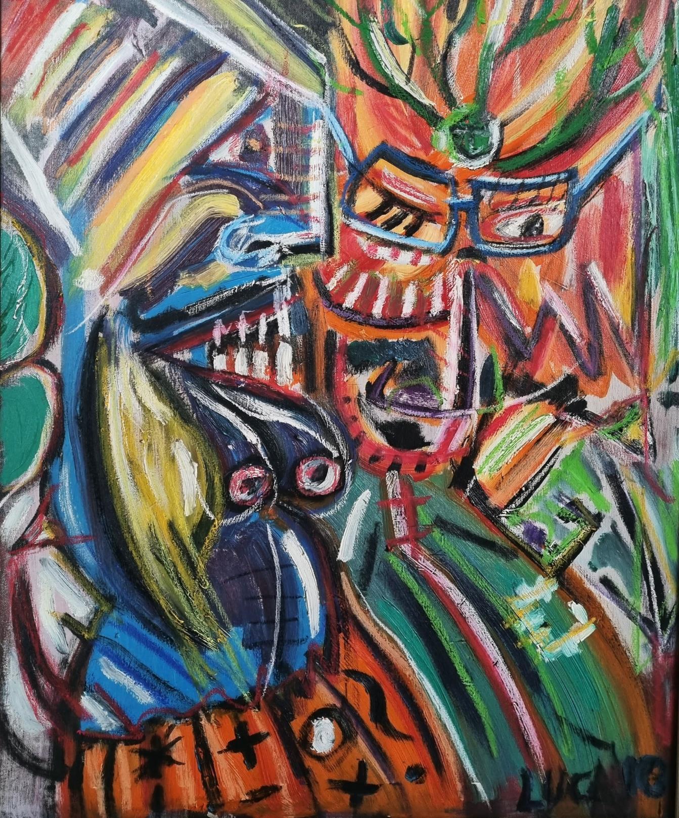 Interessante il filo del discorso emotivo dell’uomo che, partendo dalla punta della matita alla sua sinistra, traccia una linea netta che fuoriesce dalla tela e ricompare dalla parte di lei, riavvolto in un’altra matita (un’altra storia da raccontare ?!