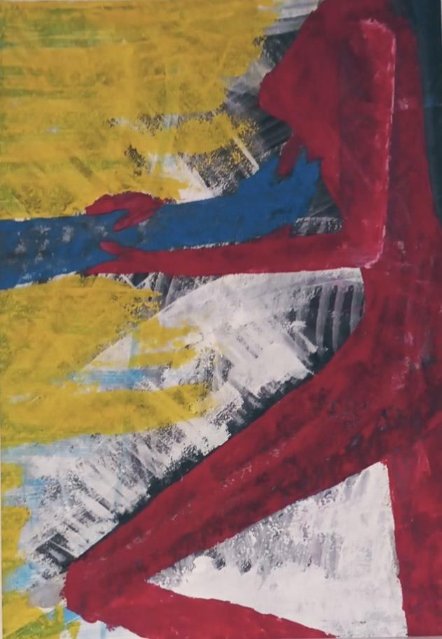 Lungo i crinali montani antropomorfizzati spiccano nello spazio aereo stampi di presunte abitazioni, tutte all’aria o capovolte; come se in quella terra di nessuno, ove li accomuna la passione d’amore(sentito più intensamente da lui piuttosto che da lei, poiché il vissuto dardeggia di rosso sangue dal lato maschile e va via via affievolendosi, sfumando in un arancione dorato dalla parte femminile) , non ci fosse tempo per le convenzioni e/o la normalità e andasse bene lo stravolgimento di abitudini o della vita di routine…